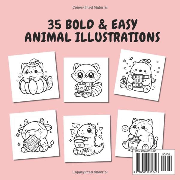 Cute and funny coloring book with animals combined with fruits and food for kids and adults! 35 easy to color, relaxing stress relieving designs. This coloring book features 35 easy to color, relaxing, stress relieving designs of hand-drawn illustrations such as: pumpkin cat, dino with donut, cow with waffle, cotton candy fox, strawberry frog, axolotl coffee and more! This “Animals Cute & Funny 3 Coloring Book” features: Hours of fun, creativity, and relaxation 35 hand-drawn pages to color Single-sided coloring pages to avoid bleed-through (if you use markers, put a sheet of paper behind the page you’re coloring on) Thick lines for effortless coloring Size Dimensions: 8.5 x 8.5 inches