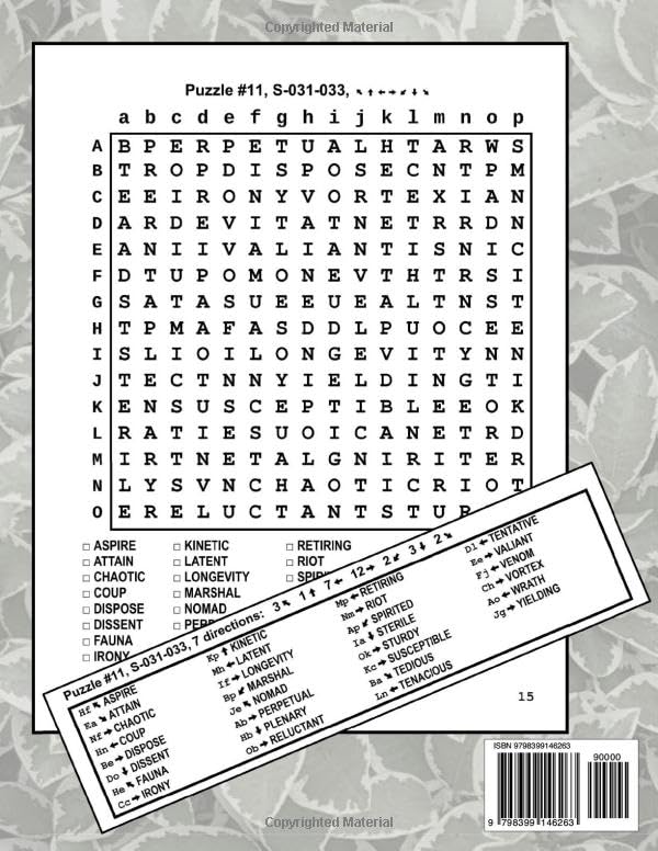 Enjoy Anon’s SAT 3000 Vocab Word Search Puzzles! One puzzle per page, on 8.5″ x 11″ paper. Largest letters to fit into smaller grids: 15×15 to 18×18. More words, 30 per puzzle, mean more fun and more playtime. Advanced algorithms are used to fit more words into smaller puzzle grids. Covers all 3000 unique SAT words in the E-book “ChatGPT Picks SAT Vocabulary 10 Levels 300 Stories 3000 Words,” in the same order. This one is an excellent companion activity book for that E-book. All 8 directions can be used in some puzzles. Simpler puzzles use fewer directions. Each puzzle shows its used directions to help you search quickly. Puzzles and answers are generated and checked by advanced algorithms to provide maximum fun and challenges. Every hidden word has exactly one location in the puzzle. Simple and clear answer keys, with the same sorted hidden words and their location and running directions. You can find the location and direction of any word immediately instead of searching in the answer grid. Compare and enjoy Anon’s specially designed large print 3000 SAT vocabulary word search puzzles!