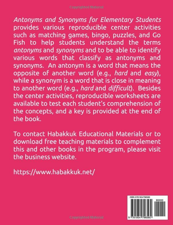Antonyms and Synonyms for Elementary Students provides various reproducible center activities such as matching games, bingo, puzzles, and Go Fish to help students understand the terms antonyms and synonyms and to be able to identify various words that classify as antonyms and synonyms. An antonym is a word that means the opposite of another word (e.g., hard and easy), while a synonym is a word that is close in meaning to another word (e.g., hard and difficult). Besides the center activities, reproducible worksheets are available to test each student’s comprehension of the concepts, and a key is provided at the end of the book.