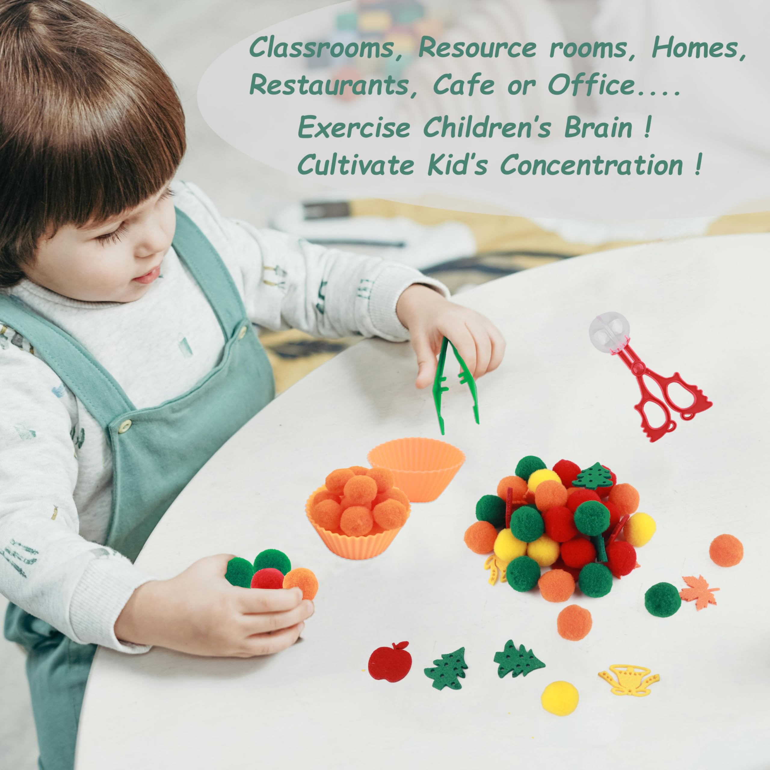 - Gaming Activity: The counting sorting sensory bin filler improves your child’s ability to recognize colors,shapes as well as their hands-on skills. The bright colors of the pom poms attract children’s attention and the soft touch keeps them engaged.