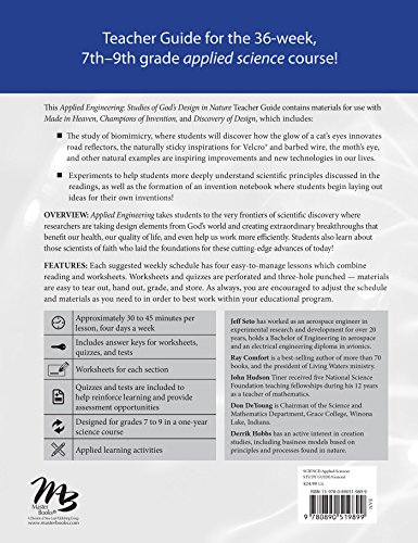 This Applied Engineering: Studies of God’s Design in Nature Teacher Guide contains materials for use with Made in Heaven, Men of Science, Men of God, and Discovery of Design, which includes: The study of biomimicry, where students will discover how the glow of a cat’s eyes innovates road reflectors, the naturally sticky inspirations for Velcro(r) and barbed wire, the moth’s eye, and other natural examples are inspiring improvements and new technologies in our lives. Experiments to help students more deeply understand scientific principles discussed in the readings, as well as the formation of an invention notebook where students begin laying out ideas for their own inventions! OVERVIEW: Applied Engineering takes students to the very frontiers of scientific discovery where researchers are taking design elements from the God’s world and creating extraordinary breakthroughs that benefit our health, our quality of life, and even help us work more efficiently. Students also learn about those scientists of faith who laid the foundations for these cutting-edge advances of today! FEATURES: Each suggested weekly schedule has four easy-to-manage lessons which combine reading and worksheets. Worksheets and quizzes are perforated and three-hole punched materials are easy to tear out, hand out, grade, and store. As always, you are encouraged to adjust the schedule and materials as you need to in order to best work within your educational program.