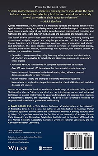 Praise for the Third Edition “Future mathematicians, scientists, and engineers should find the book to be an excellent introductory text for coursework or self-study as well as worth its shelf space for reference.” –MAA Reviews Applied Mathematics, Fourth Edition is a thoroughly updated and revised edition on the applications of modeling and analyzing natural, social, and technological processes. The book covers a wide range of key topics in mathematical methods and modeling and highlights the connections between mathematics and the applied and natural sciences. The Fourth Edition covers both standard and modern topics, including scaling and dimensional analysis; regular and singular perturbation; calculus of variations; Green’s functions and integral equations; nonlinear wave propagation; and stability and bifurcation. The book provides extended coverage of mathematical biology, including biochemical kinetics, epidemiology, viral dynamics, and parasitic disease. In addition, the new edition features: Expanded coverage on orthogonality, boundary value problems, and distributions, all of which are motivated by solvability and eigenvalue problems in elementary linear algebra Additional MATLAB(r) applications for computer algebra system calculations Over 300 exercises and 100 illustrations that demonstrate important concepts New examples of dimensional analysis and scaling along with new tables of dimensions and units for easy reference Review material, theory, and examples of ordinary differential equations New material on applications to quantum mechanics, chemical kinetics, and modeling diseases and viruses Written at an accessible level for readers in a wide range of scientific fields, Applied Mathematics, Fourth Edition is an ideal text for introducing modern and advanced techniques of applied mathematics to upper-undergraduate and graduate-level students in mathematics, science, and engineering. The book is also a valuable reference for engineers and scientists in government and industry.