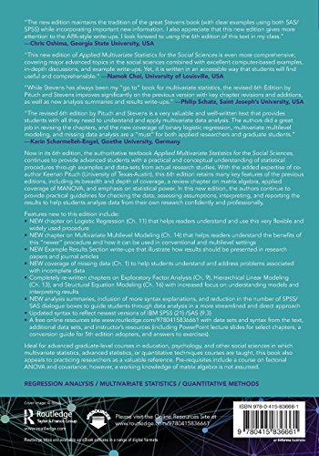 Now in its 6th edition, the authoritative textbook Applied Multivariate Statistics for the Social Sciences, continues to provide advanced students with a practical and conceptual understanding of statistical procedures through examples and data-sets from actual research studies. With the added expertise of co-author Keenan Pituch (University of Texas-Austin), this 6th edition retains many key features of the previous editions, including its breadth and depth of coverage, a review chapter on matrix algebra, applied coverage of MANOVA, and emphasis on statistical power. In this new edition, the authors continue to provide practical guidelines for checking the data, assessing assumptions, interpreting, and reporting the results to help students analyze data from their own research confidently and professionally. Features new to this edition include: NEW chapter on Logistic Regression (Ch. 11) that helps readers understand and use this very flexible and widely used procedure NEW chapter on Multivariate Multilevel Modeling (Ch. 14) that helps readers understand the benefits of this “newer” procedure and how it can be used in conventional and multilevel settings NEW Example Results Section write-ups that illustrate how results should be presented in research papers and journal articles NEW coverage of missing data (Ch. 1) to help students understand and address problems associated with incomplete data Completely re-written chapters on Exploratory Factor Analysis (Ch. 9), Hierarchical Linear Modeling (Ch. 13), and Structural Equation Modeling (Ch. 16) with increased focus on understanding models and interpreting results NEW analysis summaries, inclusion of more syntax explanations, and reduction in the number of SPSS/SAS dialogue boxes to guide students through data analysis in a more streamlined and direct approach Updated syntax to reflect newest versions of IBM SPSS (21) /SAS (9.3) A free online resources site at www.routledge.com/9780415836661 with data sets and syntax from the text, additional data sets, and instructors resources (including PowerPoint lecture slides for select chapters, a conversion guide for 5th edition adopters, and answers to exercises). Ideal for advanced graduate-level courses in education, psychology, and other social sciences in which multivariate statistics, advanced statistics, or quantitative techniques courses are taught, this book also appeals to practicing researchers as a valuable reference. Pre-requisites include a course on factorial ANOVA and covariance; however, a working knowledge of matrix algebra is not assumed.