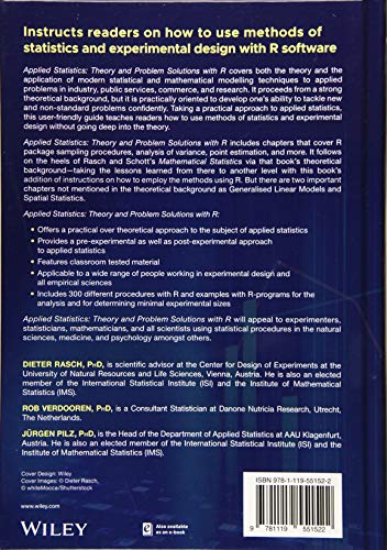 Instructs readers on how to use methods of statistics and experimental design with R software Applied statistics covers both the theory and the application of modern statistical and mathematical modelling techniques to applied problems in industry, public services, commerce, and research. It proceeds from a strong theoretical background, but it is practically oriented to develop one’s ability to tackle new and non-standard problems confidently. Taking a practical approach to applied statistics, this user-friendly guide teaches readers how to use methods of statistics and experimental design without going deep into the theory. Applied Statistics: Theory and Problem Solutions with R includes chapters that cover R package sampling procedures, analysis of variance, point estimation, and more. It follows on the heels of Rasch and Schott’s Mathematical Statistics via that book’s theoretical background–taking the lessons learned from there to another level with this book’s addition of instructions on how to employ the methods using R. But there are two important chapters not mentioned in the theoretical back ground as Generalised Linear Models and Spatial Statistics. Offers a practical over theoretical approach to the subject of applied statistics Provides a pre-experimental as well as post-experimental approach to applied statistics Features classroom tested material Applicable to a wide range of people working in experimental design and all empirical sciences Includes 300 different procedures with R and examples with R-programs for the analysis and for determining minimal experimental sizes Applied Statistics: Theory and Problem Solutions with R will appeal to experimenters, statisticians, mathematicians, and all scientists using statistical procedures in the natural sciences, medicine, and psychology amongst others.