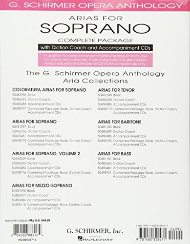 (Vocal Collection). This all-in-one package includes the original Arias for Soprano book from the G. Schirmer Opera Anthology along with two accompaniment CDs AND the corresponding Diction Coach book/two CD set. Diction Coach includes recorded diction lessons, IPA, and word for word translations. In addition to piano accompaniments playable on both your CD player and computer, the enhanced accompaniment CDs also include tempo adjustment software for CD-ROM computer use. Contents: Ach, Ich Fuhl’s (The Magic Flute) * Adieu, Notre Petite Table (Massenet) * Ah Je Rise De Me Voir * Ah Je Veux Vivre * Batti, Batti, O Bel Masetto * Bester Jungling * The Black Swan * Caro Nome * Deh Vieni, Non Tardar (The Marriage Of Figaro) * Donde Lieta Usci * Dove Sono I Bei Momenti * Elle A Fui, La Tourterelle * Fair Robin I Love * Je Dis Que Rien Ne M’epouvante * Kommt Ein Schlanker Bursch Geg- * Mi Chiamano Mimi * Monica’s Waltz * O Mio Babbino Caro * O War’ Ich Schon Mit Dir Vereint * Porgi, amor from Le Nozze di Figaro * Quando Men Vo * Saper Vorreste (Verdi) * Signore Ascolta * The Silver Aria * Stridono Lassu * Sul Fil D’un Soffio (Verdi) * Tu Che Di Gel Sei Cinta * Un Bel Di Vedremo * V’adoro, Pupille * Vedrai, Carino * Willow Song