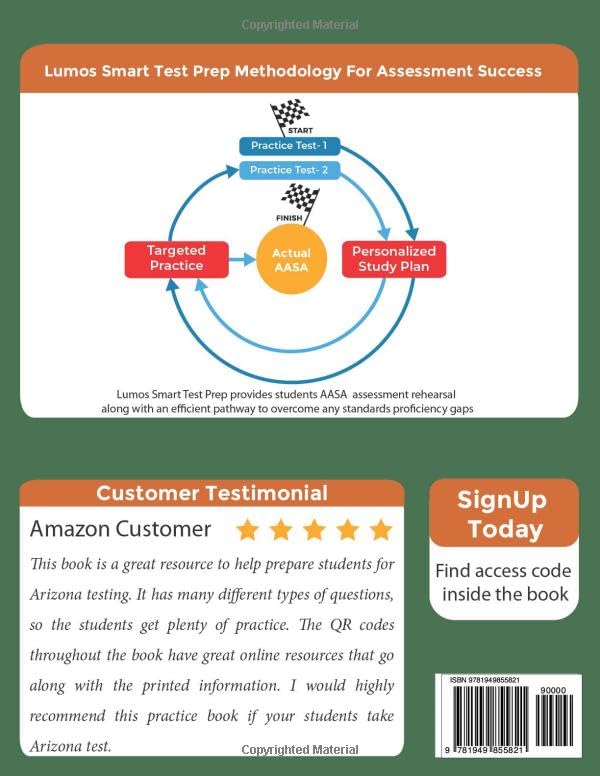 Arizona’s Academic Standards Assessment (AASA) 3rd Grade English Language Arts Workbook for Kids (Ages 8-9) updated for 2023-24. Boost your child’s AASA test scores using the Lumos Grade 3 English language Arts Test Prep Workbook. Crafted by expert educators, this workbook comprehensively covers over 40+ essential ELA skills tailored for third graders. Featuring a wide variety of standards-aligned practice questions, the Lumos AASA workbook supports your child to enhance ELA proficiency through consistent daily and weekly practice, resulting in improved AASA test scores. Why You’ll Love This 3rd Grade English Book for 2023-24 AASA Test Prep Excel in 40+ Essential ELA Skills: Master key ELA concepts including Reading: Literature, Reading: Informational Text, and Language. This comprehensive workbook fosters not just success in the Arizona State assessment, but also cultivates a robust academic groundwork. Boost State Test Success: Lumos AASA test prep workbooks break free from traditional print workbooks. It features a wide variety of standards-aligned content in both print and online formats. Lumos Smart Test Prep Methodology: Unlock success on the Arizona State test (AASA) powered by our proprietary Lumos Smart Test Prep Methodology. It provides simulated AASA practice and remediation tools to overcome proficiency gaps. Replicated AASA Practice: Access 2 full-length online practice tests mirroring the AASA blueprint–question types, tech-enhanced items, duration, rigor of the standards, and more. Plus, the look and feel are the same as the actual AASA computerized test, fostering comfort with the AASA format, and boosting test readiness. Important Note: Once you register for the online program, the first practice test gets auto-assigned by Lumos Support. Personalized Study Plan for Targeted Remediation: Using your child’s performance data from the online AASA-like practice tests, the online program generates a personalized study plan. This plan includes a checklist of standards tailored to your child’s needs, guiding them to improve with relevant practice questions from our workbook and online program. Track Your Child’s Progress and Growth: Gain valuable insights with an intuitive dashboard in the online program to monitor advancement and pinpoint strong and weak areas. About Lumos Learning Lumos Learning has been a trusted partner in providing state test preparation resources to parents and educators for over 16 years. With an impressive reach of over 1 million students, 125,000 teachers, and 44,000 schools, our proven study programs improve student outcomes in state assessments. Versatile and Flexible Learning Solution At-Home Learning Classroom Learning Home Tutoring & Home Schooling. Resources in the Print Workbook 3 chapters covering 40+ ELA skills Answer keys with detailed explanations Resources in the Online Program 2 full-length practice tests mirroring the AASA blueprint Personalized study plan for targeted remediation Supplementary resources: solved examples, videos, and more User-friendly dashboard and performance reports for progress measurement Access AASA Online Resources in 3 Easy Steps Scan the QR code or visit www.lumoslearning.com/a/tedbooks Enter the access code provided within the print workbook Provide basic details and get started! Grab your copy of the Lumos AASA 3rd-grade English Language Arts workbook today and boost your child’s Arizona State test scores!