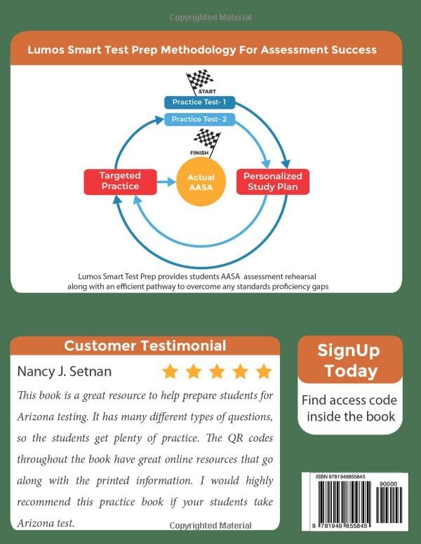Arizona’s Academic Standards Assessment (AASA) 5th Grade English Language Arts Workbook for Kids (Ages 10-11) updated for 2023-24. Boost your child’s AASA test scores using the Lumos Grade 5 English language Arts Test Prep Workbook. Crafted by expert educators, this workbook comprehensively covers over 40+ essential ELA skills tailored for fifth graders. Featuring a wide variety of standards-aligned practice questions, the Lumos AASA workbook supports your child to enhance ELA proficiency through consistent daily and weekly practice, resulting in improved AASA test scores. Why You’ll Love This 5th Grade English Book for 2023-24 AASA Test Prep Excel in 40+ Essential ELA Skills: Master key ELA concepts including Reading: Literature, Reading: Informational Text, and Language. This comprehensive workbook fosters not just success in the Arizona State assessment, but also cultivates a robust academic groundwork. Boost State Test Success: Lumos AASA test prep workbooks break free from traditional print workbooks. It features a wide variety of standards-aligned content in both print and online formats. Lumos Smart Test Prep Methodology: Unlock success on the Arizona State test (AASA) powered by our proprietary Lumos Smart Test Prep Methodology. It provides simulated AASA practice and remediation tools to overcome proficiency gaps. Replicated AASA Practice: Access 2 full-length online practice tests mirroring the AASA blueprint–question types, tech-enhanced items, duration, rigor of the standards, and more. Plus, the look and feel are the same as the actual AASA computerized test, fostering comfort with the AASA format, and boosting test readiness. Important Note: Once you register for the online program, the first practice test gets auto-assigned by Lumos Support. Personalized Study Plan for Targeted Remediation: Using your child’s performance data from the online AASA-like practice tests, the online program generates a personalized study plan. This plan includes a checklist of standards tailored to your child’s needs, guiding them to improve with relevant practice questions from our workbook and online program. Track Your Child’s Progress and Growth: Gain valuable insights with an intuitive dashboard in the online program to monitor advancement and pinpoint strong and weak areas. About Lumos Learning Lumos Learning has been a trusted partner in providing state test preparation resources to parents and educators for over 16 years. With an impressive reach of over 1 million students, 125,000 teachers, and 44,000 schools, our proven study programs improve student outcomes in state assessments. Versatile and Flexible Learning Solution At-Home Learning Classroom Learning Home Tutoring & Home Schooling. Resources in the Print Workbook 3 chapters covering 40+ ELA skills Answer keys with detailed explanations Resources in the Online Program 2 full-length practice tests mirroring the AASA blueprint Personalized study plan for targeted remediation Supplementary resources: solved examples, videos, and more User-friendly dashboard and performance reports for progress measurement Access AASA Online Resources in 3 Easy Steps Scan the QR code or visit www.lumoslearning.com/a/tedbooks Enter the access code provided within the print workbook Provide basic details and get started! Grab your copy of the Lumos AASA 5th-grade English Language Arts workbook today and boost your child’s Arizona State test scores!