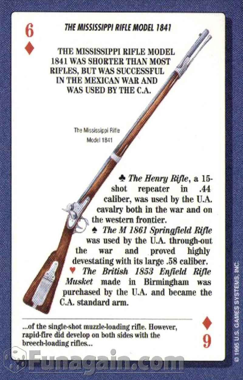 The Civil War Series Card Games honor the people and the events of the war between the two factions of our young nation. Instructions are included with each deck. The decks may also be used for most standard card games.This deck describes and illustrates the weaponry used by soldiers during America’s most divisive battles.See also: Flags of the Civil War, Uniforms of the Civil War, Famous Battles of the Civil War, Famous Generals of the Civil War, Famous Women of the Civil War, and Civil War Series Card Game 12-deck Display.
