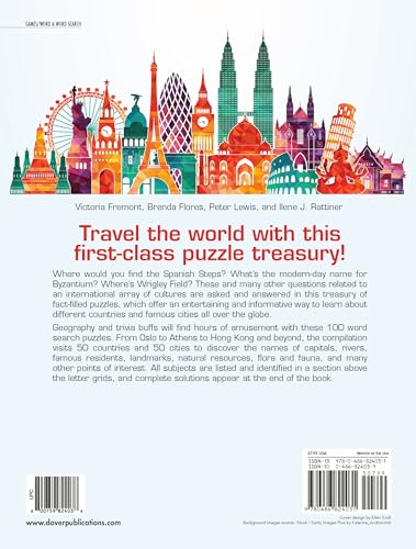 Get ready to explore the world, one mind-bending puzzle at a time! Pack your curiosity and grab your pencil – the world awaits in this captivating puzzle treasury! Travel the world with this first-class puzzle treasury! Where would you find the Spanish Steps? What’s the modern-day name for Byzantium? Where’s Wrigley Field? These and many other questions related to an international array of cultures are asked and answered in this treasury of fact-filled puzzles, which offer an entertaining and informative way to learn about different countries and famous cities all over the globe. Geography and trivia buffs will find hours of amusement with these 100 word search puzzles. From Oslo to Athens to Hong Kong and beyond, the compilation visits 50 countries and 50 cities to discover the names of capitals, rivers, famous residents, landmarks, natural resources, flora and fauna, and many other points of interest. All subjects are listed and identified in a section above the letter grids, and complete solutions appear at the end of the book. 50 Countries, 50 Cities: Journey across breathtaking landscapes and vibrant metropolises as you tackle 100 word searches spanning the globe. From the bustling streets of Brazil and Tokyo to the ancient ruins of Egypt and Rome, every puzzle promises a new cultural adventure. Geography and Trivia Treasures: Test your knowledge and discover fascinating facts about capitals, rivers, landmarks, iconic residents, and local flora and fauna across Asia, Africa, Europe, South America, the USA, and more. Each puzzle is a delightful blend of challenge and learning. Sharpen Your Skills: Hone your vocabulary, memory, and spatial reasoning as you navigate through grids filled with hidden words. These puzzles are perfect for solo brain benders or fun family evenings! Solutions Made Easy: Stumped on a word? Relax and check the comprehensive solutions section at the end of the book. No more frustration, just pure puzzle-solving satisfaction! Learning has never been more entertaining: A fantastic learning tool for children ages 12 and up, adults, and senior citizens. These puzzles offer a delightful way to expand your knowledge base about the world, igniting curiosity and sparking conversations. Makes a unique and thoughtful gift for travel enthusiasts and puzzle lovers. 128 pages, 8 1/4 x 10 7/8 Inches.