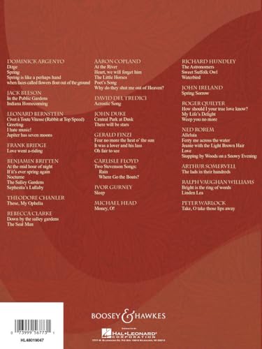 A Rich Collection of Classical Art Songs * This essential vocal collection features 50 carefully selected art songs by 21 renowned American and British composers. Designed for high voice, this edition provides an unparalleled variety of repertoire for singers, making it an ideal resource for students, teachers, and performers. * * Perfect for Singers and Educators * Whether you are a voice student, professional vocalist, or music educator, this book offers expertly transcribed songs in their original keys. Many pieces appear in print for the first time in these transpositions, allowing greater accessibility to singers with different vocal ranges. * * Authentic Edition from Boosey and Hawkes * Edited by Carol Kimball, this softcover edition preserves the authenticity of each composition while providing insightful editorial notes. It serves as a valuable addition to any singer’s music library, offering selections suited for recitals, competitions, and auditions. * * Songs Included * Dirge * Spring * Spring Is Like a Perhaps Hand * When Faces Called Flowers Float out of the Ground * In the Public Gardens * Indiana Homecoming * Civet a Toute Vitesse (Rabbit at Top Speed) * Greeting * I Hate Music! * Jupiter Has Seven Moons * Love Went a-Riding * At the Mid Hour of Night * If It’s Ever Spring Again * Nocturne * The Salley Gardens * Sephestia’s Lullaby * These, My Ophelia * Down by the Salley Gardens * The Seal Man * At the River * Heart, We Will Forget Him * The Little Horses * Poet’s Song * Why Do They Shut Me Out of Heaven? * Acrostic Song * Central Park at Dusk * There Will Be Stars * Fear No More the Heat o’ the Sun * It Was a Lover and His Lass * Oh Fair to See * Rain * Where Go the Boats? * Sleep * Money, O! * The Astronomers * Sweet Suffolk Owl * Waterbird * My Life’s Delight * Weep You No More * Alleluia * Ferry Me Across the Water * Jeanie with the Light Brown Hair * Love * Stopping by Woods on a Snowy Evening * The Lads in Their Hundreds * and others.