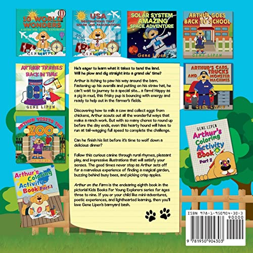 He’s eager to learn what it takes to tend the land. Will he plow and dig straight into a grand ole’ time? Arthur is itching to paw his way around the barn. Fastening up his overalls and putting on his straw hat, he can’t wait to journey to a special site… a farm! Happy as a pig in mud, this frisky pup is bouncing with energy and ready to help out in the farmer’s fields. Discovering how to milk a cow and collect eggs from chickens, Arthur scouts out all the wonderful ways that make a ranch work. But with so many chores to round up before the day ends, even this hearty hound will have to run at tail-wagging full speed to complete the challenge. Can he finish his list before it’s time to wolf down a delicious dinner? Follow this curious canine through rural rhymes, pleasant play, and impressive illustrations that will satisfy your senses. The good times never stop as Arthur sets off for a marvelous experience of finding a magical garden, buzzing behind busy bees, and picking crisp apples. Arthur on the Farm is the endearing eighth book in the pictorial Kids Books For Young Explorers series for ages three to nine. If you or your child like mini-adventures, poetic experiences, and lighthearted learning, then you’ll love Gene Lipen’s barnyard bash. Buy Arthur on the Farm to get everything done before hitting the hay today!