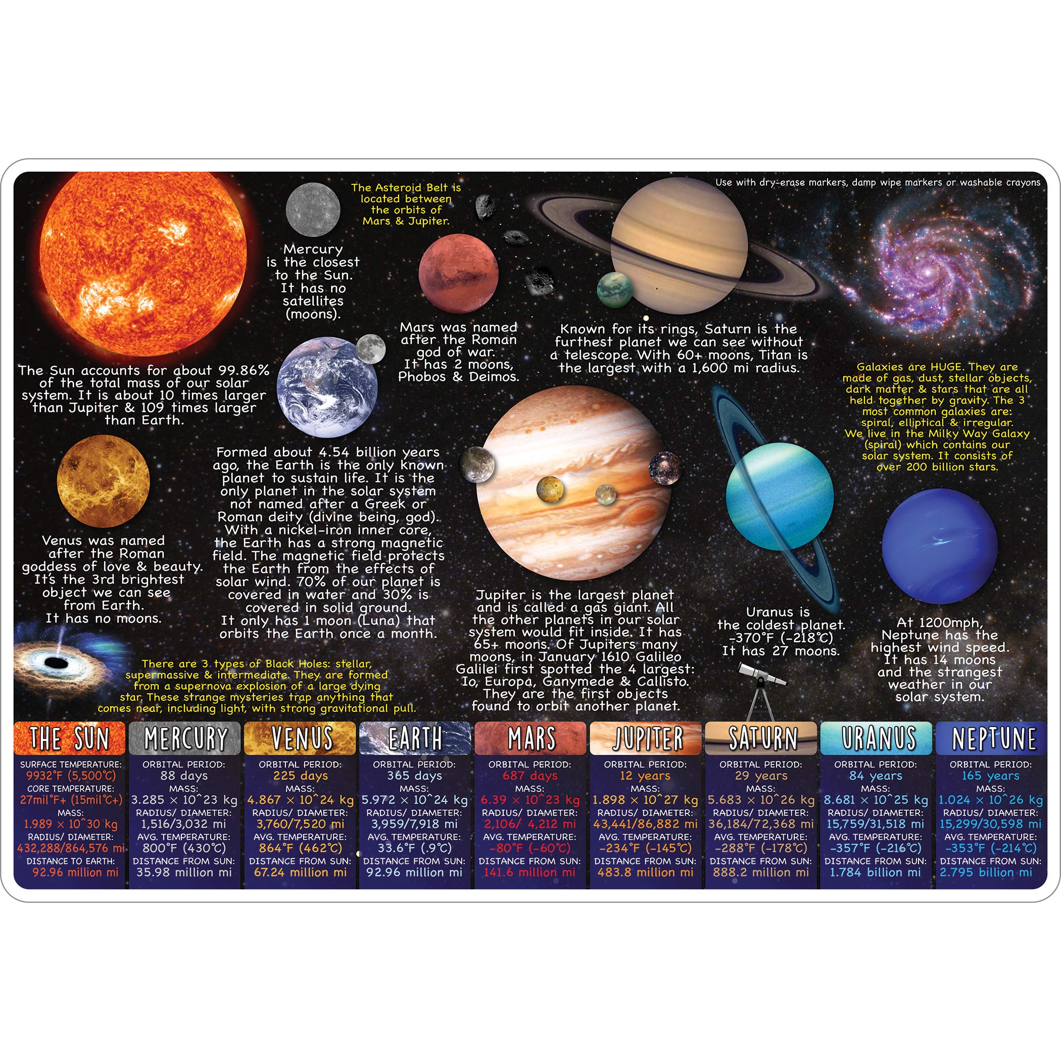 Smart poly(tm) Material has been designed for the classroom and home. The material is strong, durable, water resistant, and does not need lamination. Learn planets in orbit around the sun, galaxies, black holes and constellations in our night sky. Detailed information about each planet/system on the back. Heavy duty double-sided surface for fun and colorful learning on both sides. Write-on/wipe-off surface. Use with dry erase or water based markers and washable crayons. Each side is an interactive lesson. Mat measures 12″ x 17″.
