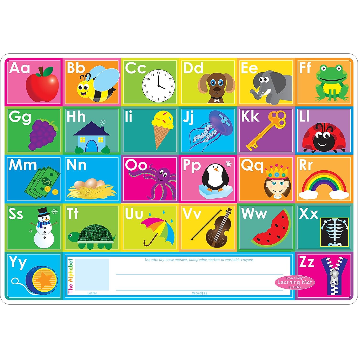 Smart poly(tm) Material has been designed for the classroom and home. The material is strong, durable, water resistant, and does not need lamination. Heavy duty double-sided surface for fun and colorful learning on both sides. Write-on/wipe-off surface. Use with dry erase or water based markers and washable crayons. Each side is an interactive lesson. Mat measures 12″ x 17″.