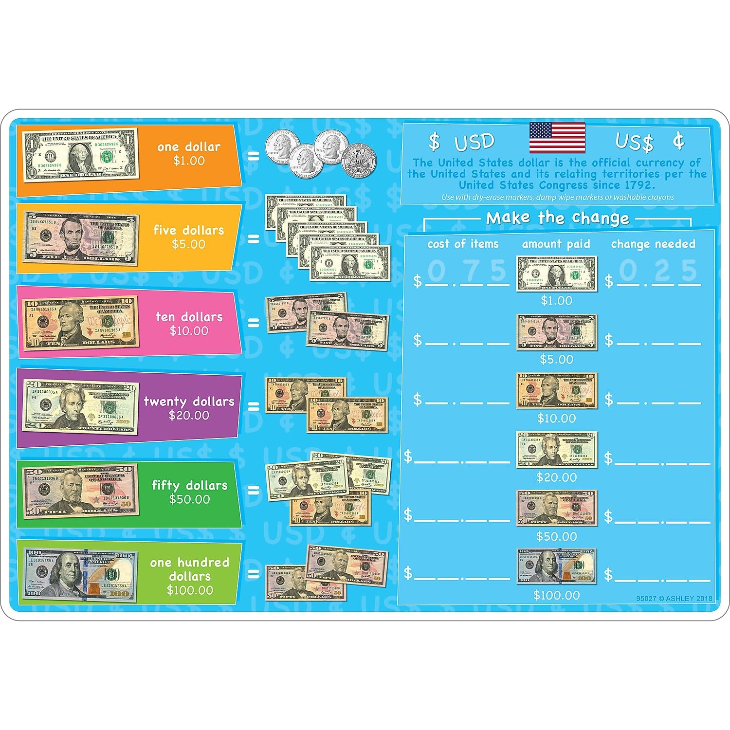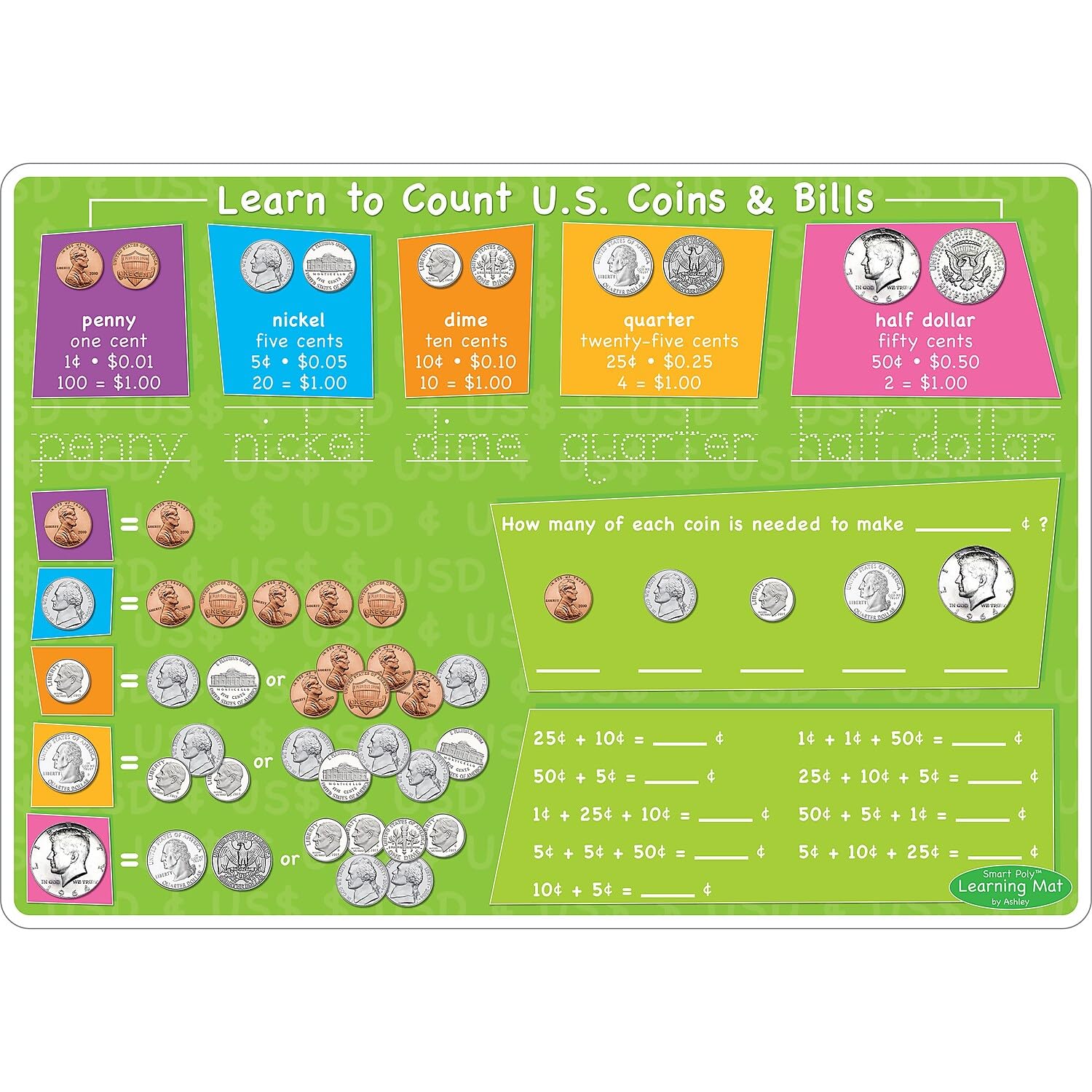 Smart poly(tm) Material has been designed for the classroom and home. The material is strong, durable, water resistant, and does not need lamination. Practice making change, and learn about coins on the front and dollars on the back. Heavy duty double-sided surface for fun and colorful learning on both sides. Write-on/wipe-off surface. Use with dry erase or water based markers and washable crayons. Each side is an interactive lesson. Mat measures 12″ x 17″.