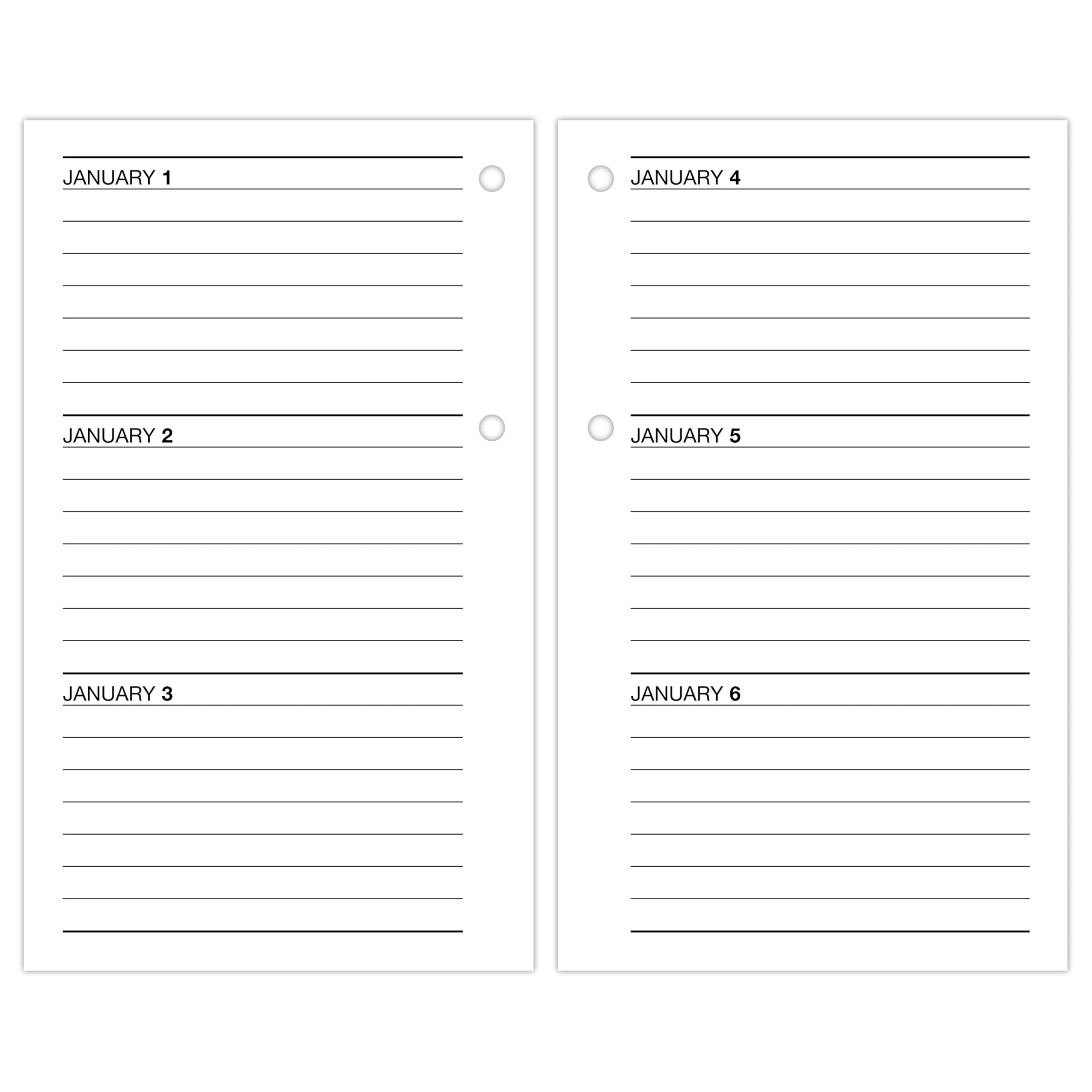 AT-A-GLANCE Daily Loose-Leaf Desk Calendar Refill pages help you stay organized and prioritize your schedule. Covers 12 months from January 2026 — December 2026 with Julian dates for a full year of planning. Each weekday covers two pages and has ruled appointment times on one side and open planning space on the other. Weekends share a two-page spread. Pages measure 3.5″ x 6″. Half-hourly weekday appointment times run from 7:00 a.m. – 5:00 p.m. Weekends have condensed half-hourly appointment times for relaxed planning. Past, current and future month calendar references are shown for quick date checking and future planning. Special pages include a 3-year reference calendar and 3-year holiday list. Reuse your favorite base year after year. These refill pages fit standard 17 Style bases with 2 rings, sold separately.