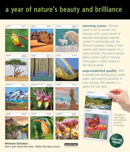 Enjoy a year of stunning landscapes and beautiful nature, printed on glossy high-quality paper and presented in a sleek easel frame. WONDERFUL VARIETY: Each page of this calendar is an escape to a different scene, highlighting nature’s amazing diversity. Experience it all from deserts to rocky shorelines to the aurora borealis. GORGEOUS GIFT: Anyone who loves the environment will appreciate this beautiful and inspiring collection curated in partnership with the National Audubon Society. EXCEPTIONAL QUALITY: With beautiful full-color photography, coated paper, and exacting standards of color printing, this calendar offers the quality and feel of an art book. NOW PLASTIC FREE!: Each calendar is now packaged in a glossy, sturdy (and recyclable!) cardboard frame that opens into a desktop easel for elegant, inspiring display. No more acrylic, and no more shrink-wrap!