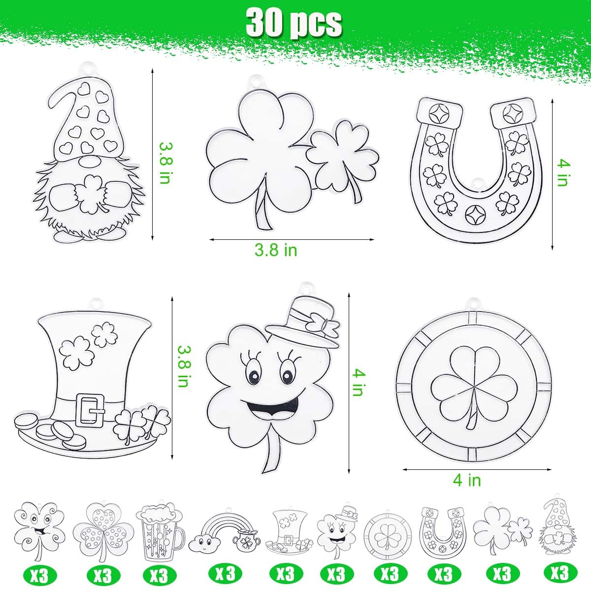 - Window Art Crafts: This St. Patrick’s Day Sun Catcher Craft Kit includes 30 sun catchers with 10 cheerful designs (3 pieces of each design).The kit also contains 450 rainbow-colored acrylic beads, 20 bottles of bright, sun-resistant paint in 10 Easter colors (6ml per bottle), 30 paintbrushes (4.9 inches), a 15-meter(590inches) roll of fishing line, and 30 suction hooks.Each sun catcher has a hole at the top for easy hanging with the fishing line