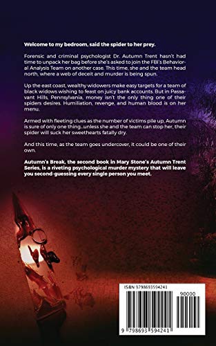 Welcome to my bedroom, said the spider to her prey. Forensic and criminal psychologist Dr. Autumn Trent hasn’t had time to unpack her bag before she’s asked to join the FBI’s Behavioral Analysis Team on another case. This time, she and the team head north, where a web of deceit and murder is being spun. Up the east coast, wealthy widowers make easy targets for a team of black widows wishing to feast on juicy bank accounts. But in Passavant Hills, Pennsylvania, money isn’t the only thing one of their spiders desires. Humiliation, revenge, and human blood is on her menu. Armed with fleeting clues as the number of victims pile up, Autumn is sure of only one thing…unless she and the team can stop her, their spider will suck her sweethearts fatally dry. And this time, as the team goes undercover, it could be one of their own. Autumn’s Break, the second book in Mary Stone’s Autumn Trent Series, is a riveting psychological murder mystery that will leave you second-guessing every single person you meet. Scroll up to one-click your copy today!