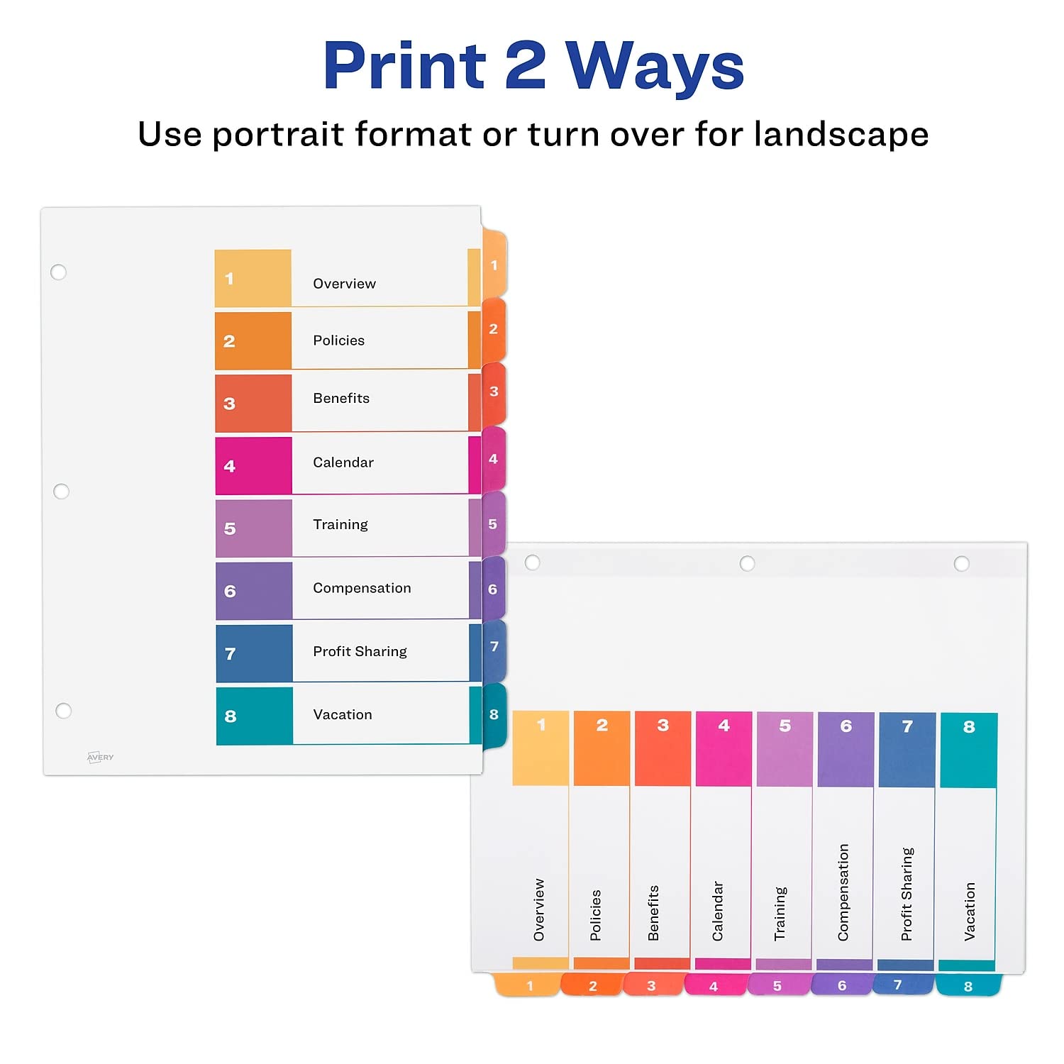 Organized documentation makes a business run like a well-oiled machine. These Ready Index Table of Contents Dividers help you stay organized so you can locate documents quickly and efficiently. They feature preprinted multicolor tabs that can be displayed in either landscape or portrait format. Using free templates from Avery Design & Print you can customize the included table of contents page and print in minutes. Organization and efficiency– makes life better for your business.