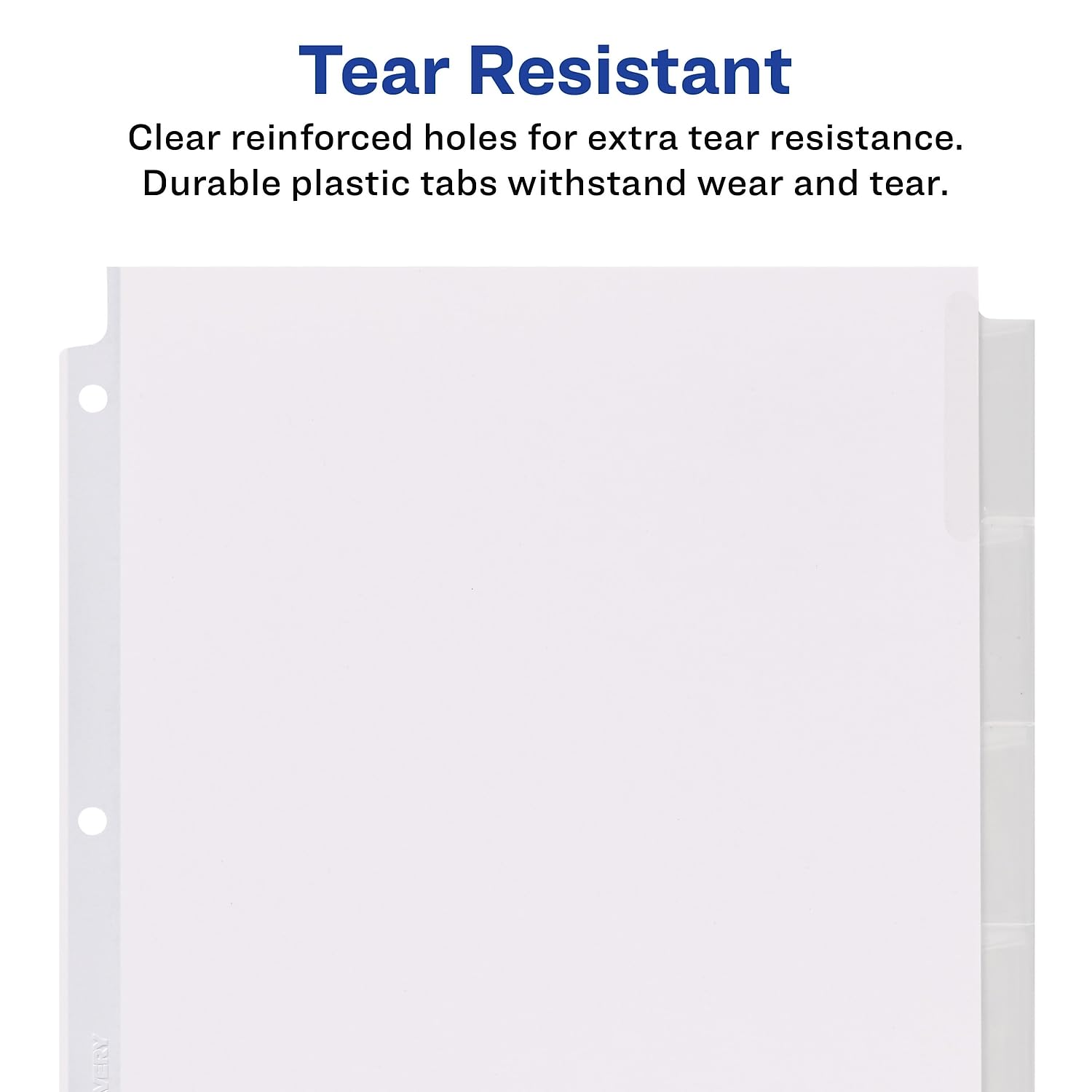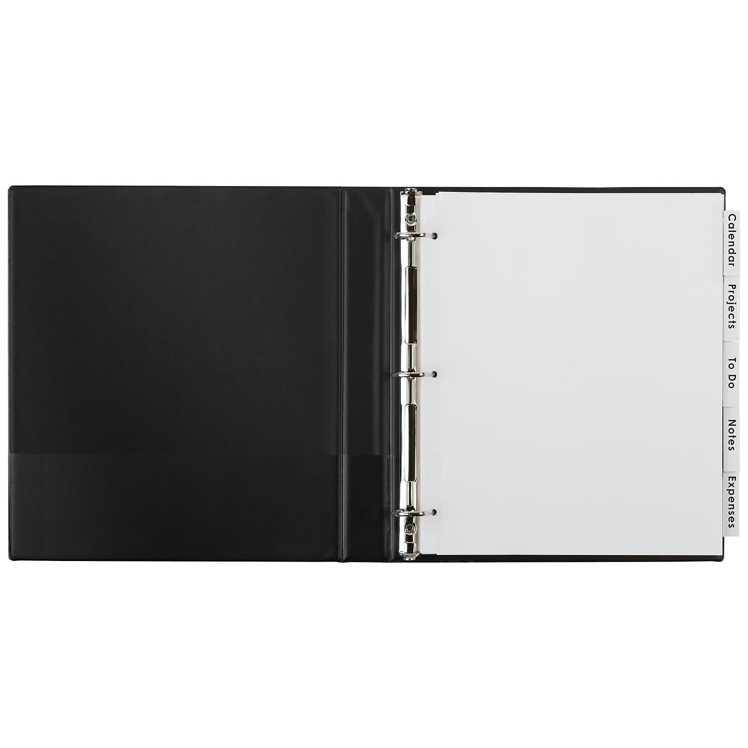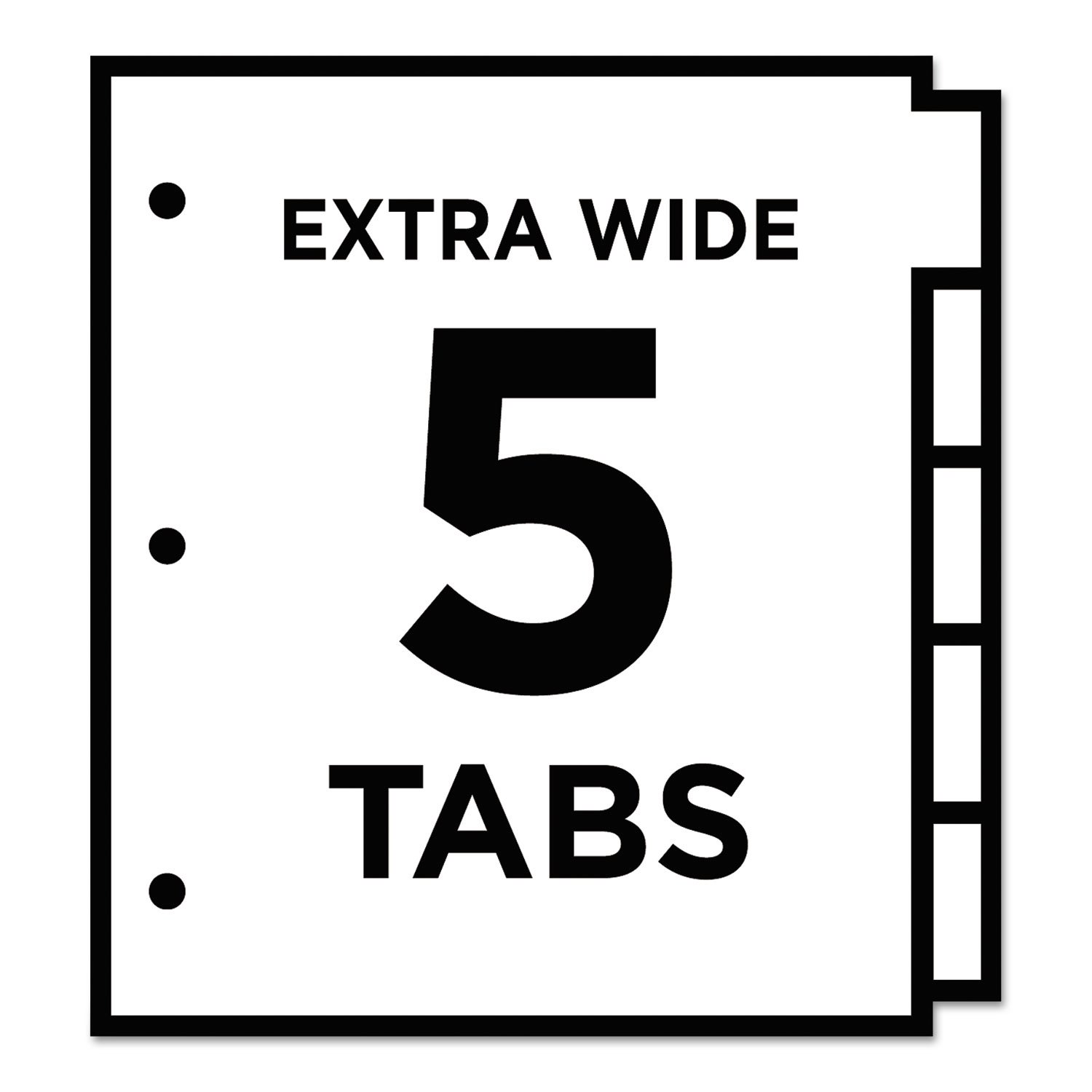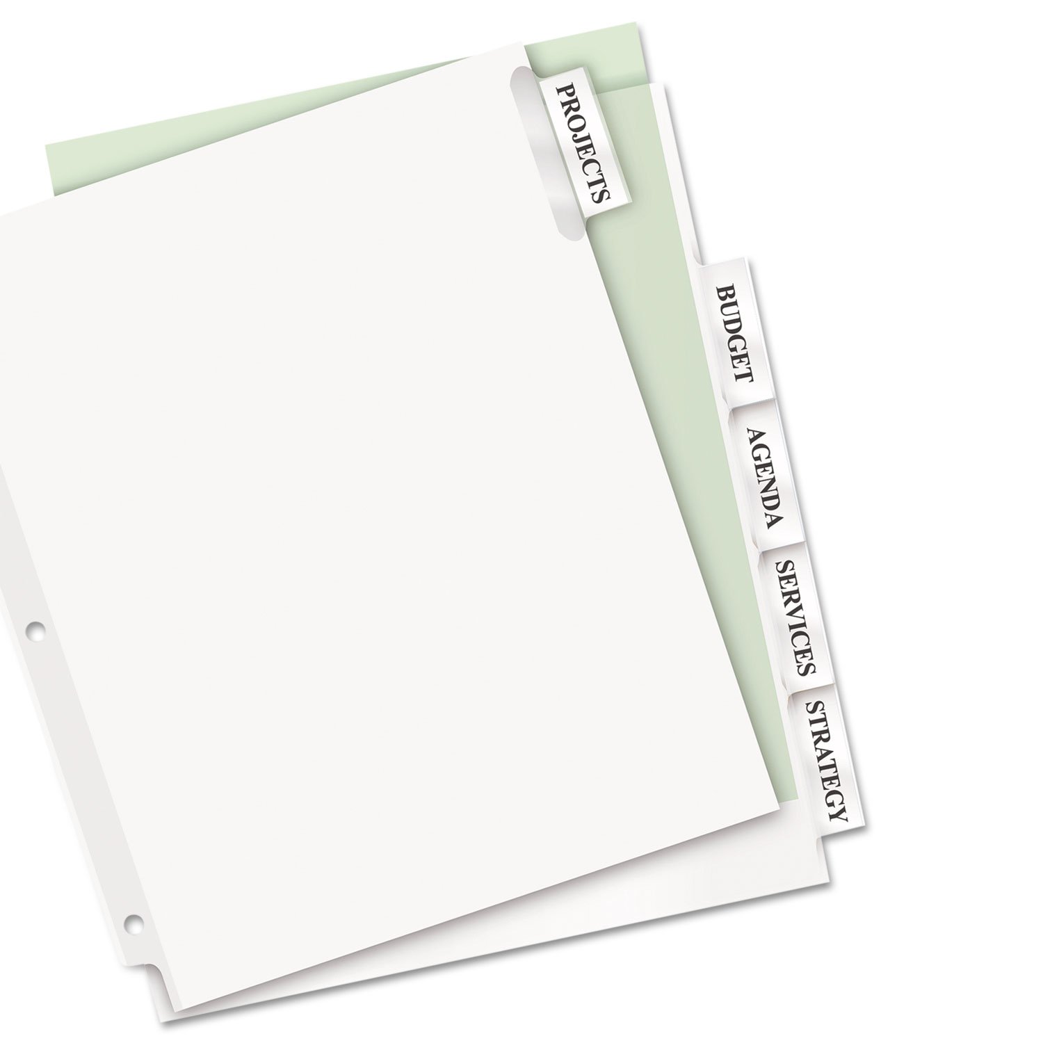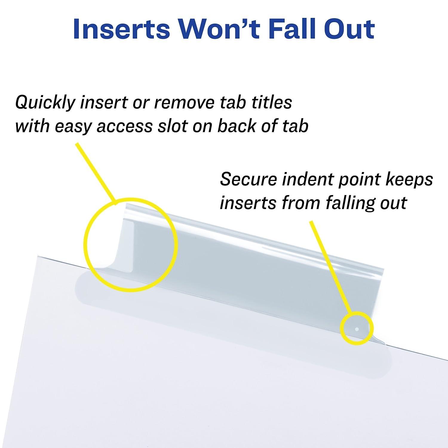 50% more printing space for tab titles than traditional tab dividers. Special tab design allows easy insertion and removal, but keeps insert securely in place. Three-hole punched for use in standard ring binders. Laser and inkjet printer compatible.