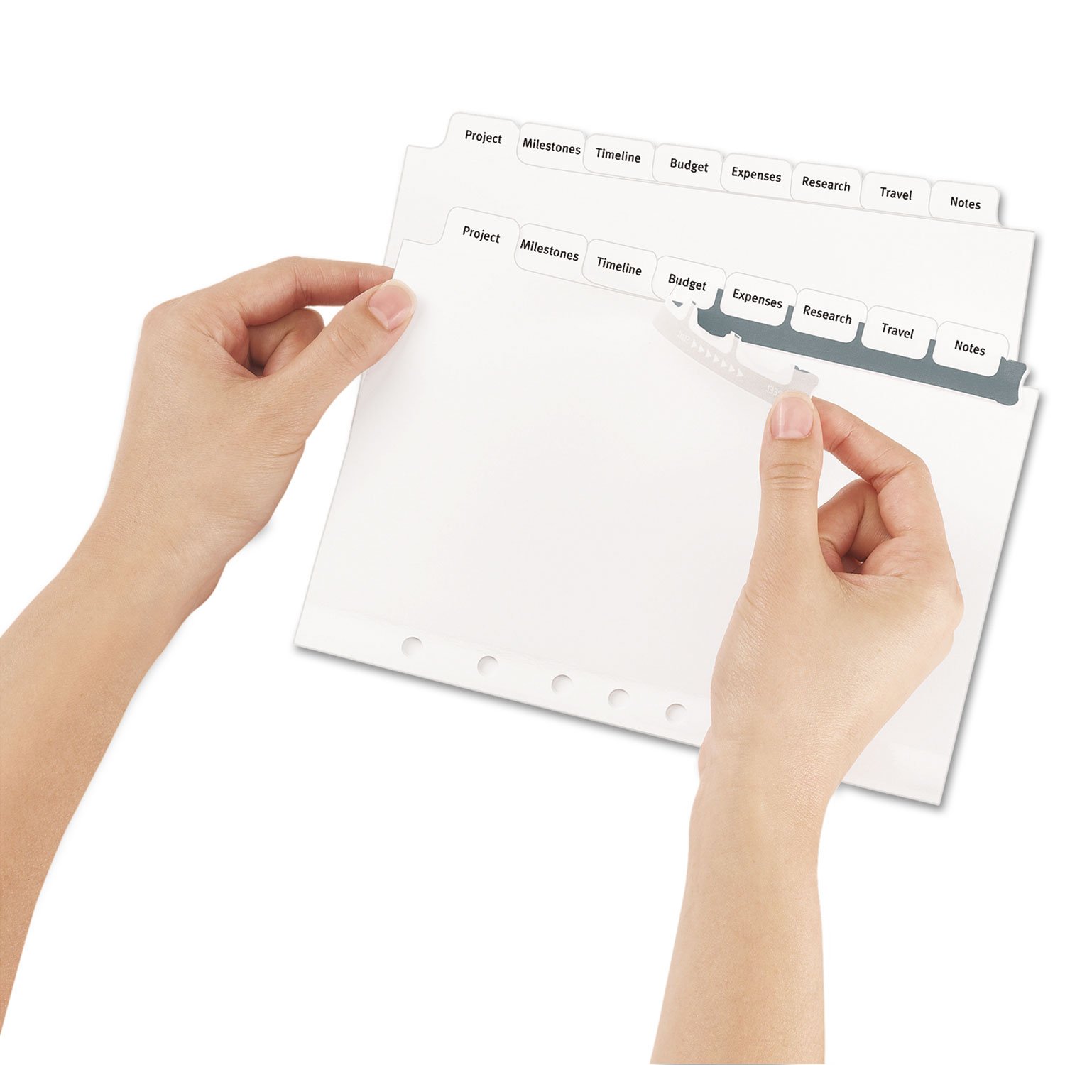 Whether you’re organizing a single project or creating multiple sets, Index Maker clear labels virtually disappear on divider tabs to give you a professional printed-on look. The Easy ApplyTM label strip lets you label all tabs at once. Easy to customize with free templates from Avery Design & Print. Big TabTM and Extra Wide selections offer greater convenience in office-wide references. Standard and mini size selections provide streamlined indexing in standard binders, planners and small personal binders.