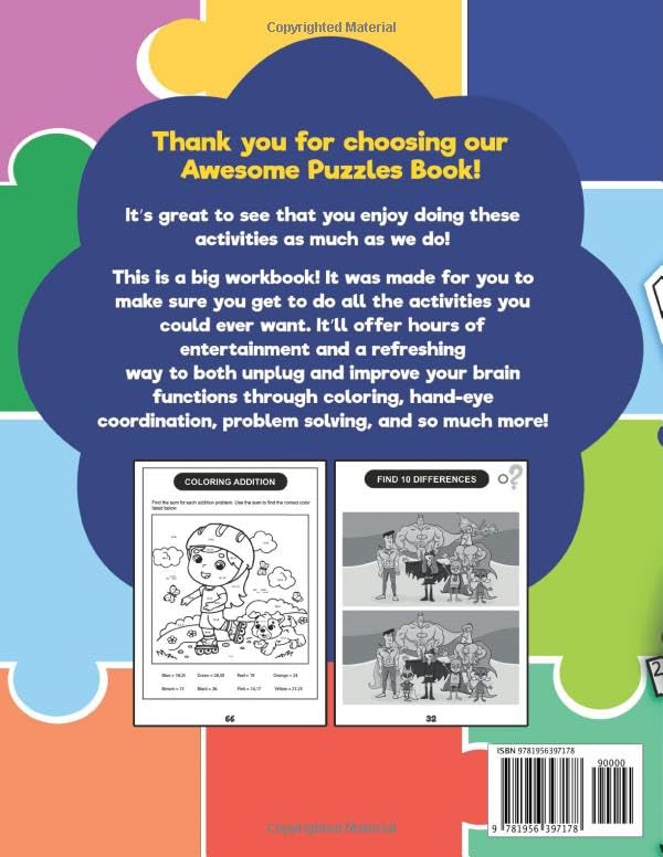Help your Child Improve Concentration, Reduce Screen Time, and Enhance Fine Motor Development! Our Awesome Puzzles Activity Book For Clever Kids provides hours of fun-filled activities! It is one of the best ways to educate kids, but at the same time entertain them. Your children will have the opportunity to practice fundamental skills like reading, counting, and enhancing creativity, all while developing a love for learning. Featuring: Produced and created by professional writers native in the English language Easy-to-follow and large activities made easy to see with simple, cute picture themes Explore fundamental skills like reading and counting while boosting creativity Improve hand-eye coordination skills with our activities Enhance productivity and improve problem-solving skills Tons of fun for everyone in the family Beyond just fun, this activity book also offers stress-busting benefits. Watch your child’s anxiety melt away and relaxation set in as they delve into their new favorite book. As a final touch, we’ve included a certificate at the back of the book to celebrate your child’s hard work and accomplishment. Ready for endless fun and learning? Order your copy to the Best Awesome Puzzles Activity Book For Clever Kids!