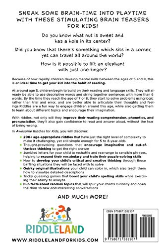 Sneak some brain-time into playtime with these stimulating brain teasers for kids Do you know what nut is sweet and has a hole in its center? Did you know that there’s something which sits in a corner, yet can travel all around the world? How is it possible to lift an elephant with just one finger? Looking for a productive yet enjoyable way for your child to spend their free time? Because of how rapidly children develop mental skills between the ages of 5 and 8, this is an ideal time to get your kid into the habit of reading. At around age 5, children begin to build on their reading and language skills. They will already be able to use descriptive words and string together sentences with more than 6 words. As they grow, they continue to expand their knowledge, absorbing facts like a sponge and learning new skills with eagerness along the way. By the time they reach the age of 7 or 8, they start to solve problems using logic rather than trial and error, and are better able to articulate their thoughts and feelings. As a parent, it is essential that you support their development and foster their minds during this critical stage. However, you also don’t want to pressure them to the point where they lose interest. Riddles are a fun way to engage children around this age, while also getting them to learn about different topics and encourage their imagination. With riddles, not only will they improve their reading comprehension, phonetics, and pronunciation, they’ll also gain confidence to read and answer aloud, without the fear of being wrong. What’s even better is that you don’t have to go far to find suitable riddles for your kids. In Awesome Riddles for Kids, you will discover: 200+ age-appropriate riddles that have just the right level of complexity to make it challenging, yet still simple enough for 5 to 8-year-olds Thought-provoking questions that encourage imaginative and out-of-the-box thinking to get the right answer Jumbled letters for your child to reshuffle and rearrange to sensible phrases, helping to expand their vocabulary and train their puzzle-solving skills How to develop your child’s critical and creative thinking through these baffling situations they will be faced with to solve Quirky original illustrations your child can color in, which also teach them how to visualize detailed descriptions Tricky guessing games that boost your child’s spelling skills while exercising their ability to analyze Fun facts about random topics that will spur your child’s curiosity and open the door to new and interesting conversations And much more. Whether you just have 5 minutes to spare on the way to school, or the whole weekend stuck indoors, you and your family can spend some quality time working out your brains together while having a laugh at the same time. Combine family time, study time, and playtime into one incredibly enjoyable family activity. Your kids won’t even realize they’re learning. If you want to nurture your child’s developing mind without overwhelming them with lessons, then scroll up and click the “Add to Cart” button right now.