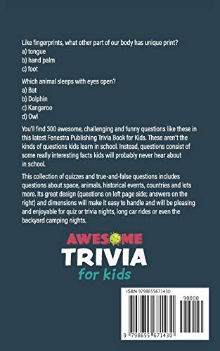 Like fingerprints, what other part of our body has unique print? a) tongue b) hand palm c) foot Which animal sleeps with eyes open? a) Bat b) Dolphin c) Kangaroo d) Owl You’ll find 300 awesome, challenging and funny questions like these in this latest Fenestra Publishing Trivia Book for Kids. These aren’t the kinds of questions kids learn in school. Instead, questions consist of some really interesting facts kids will probably never hear about in school. This collection of quizzes and true-and-false questions includes questions about space, animals, historical events, countries and lots more. Its great design (questions on left page side; answers on the right) and dimensions will make it easy to handle and will be pleasing and enjoyable for quiz or trivia nights, long car rides or even the backyard camping nights.