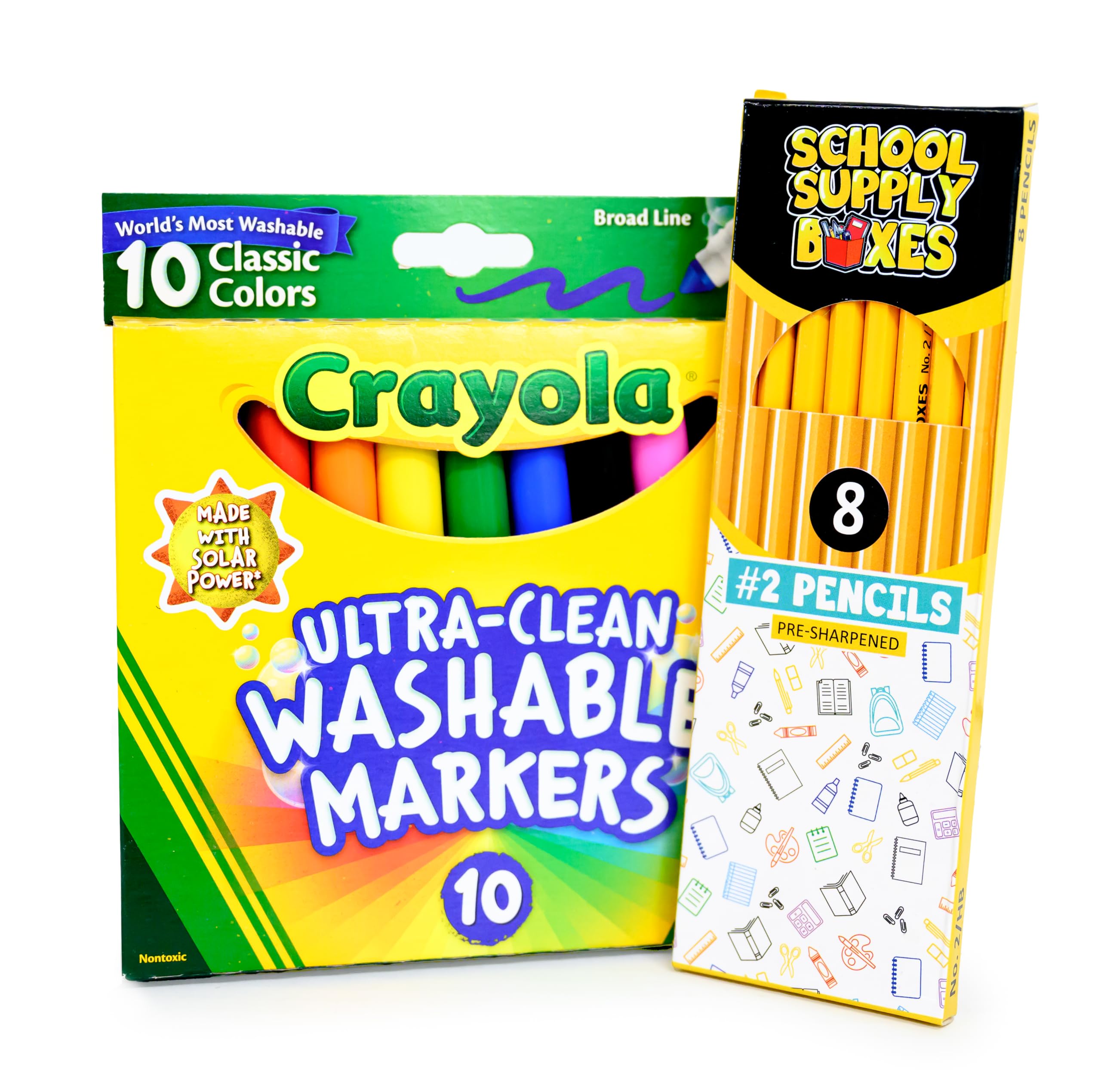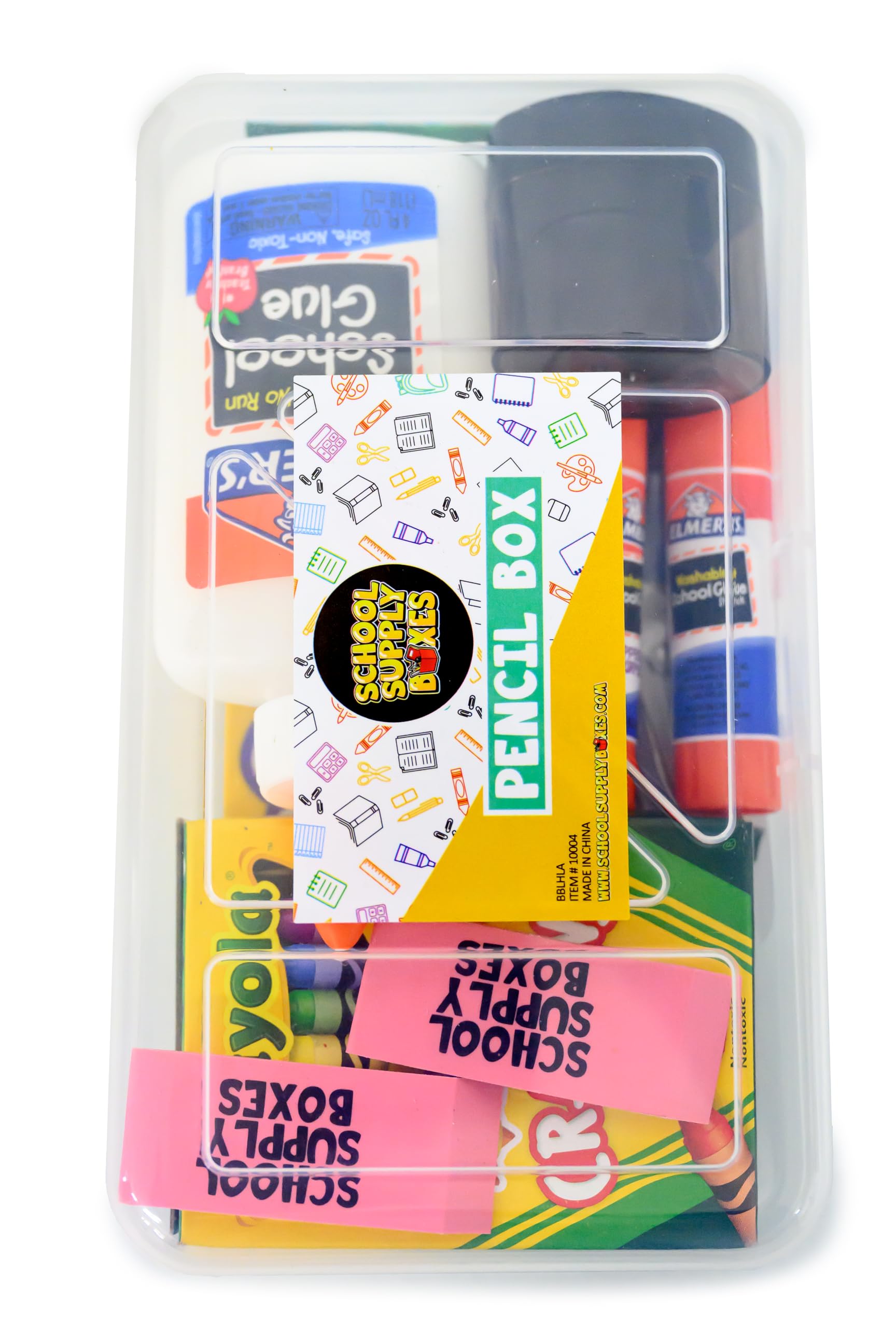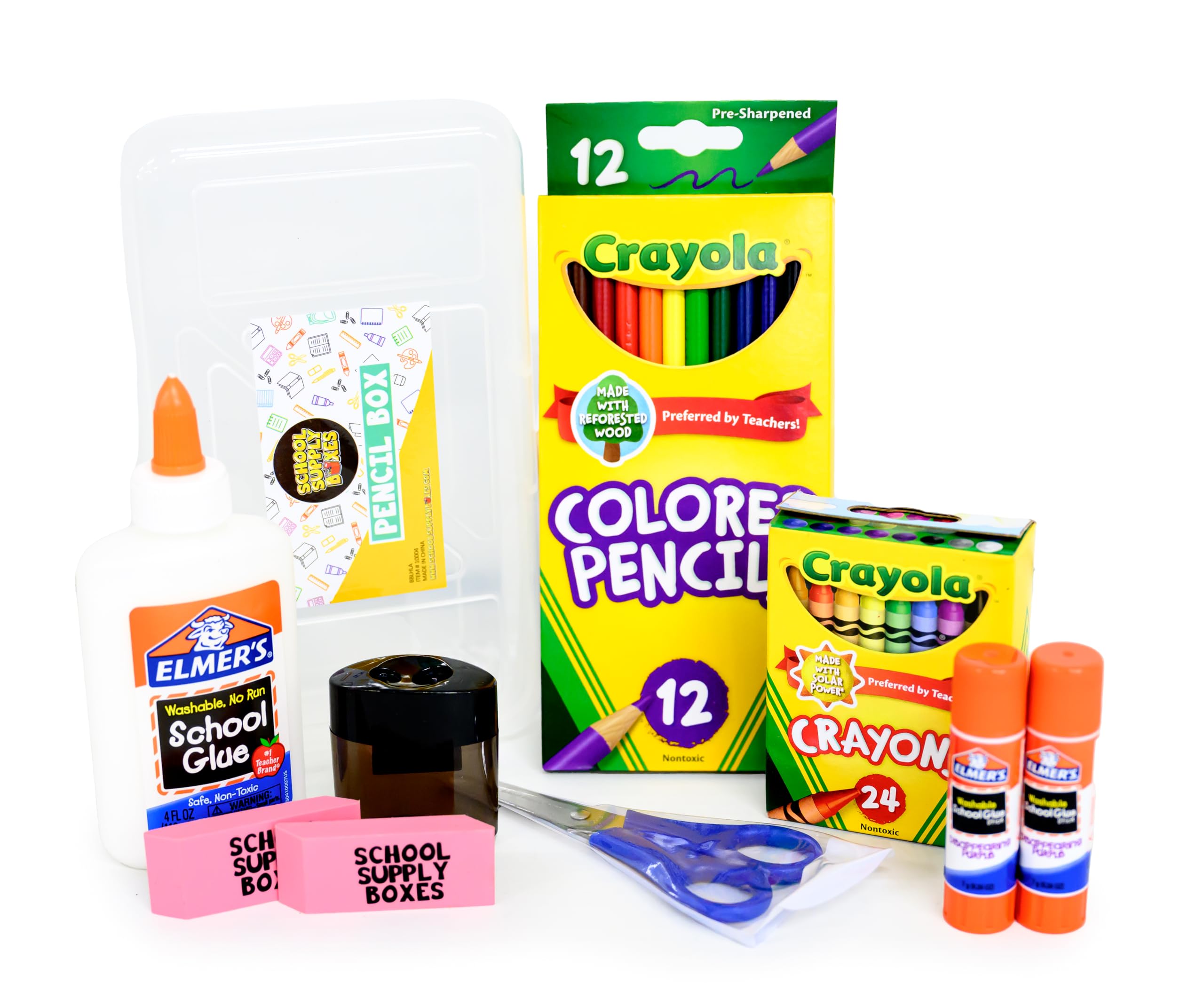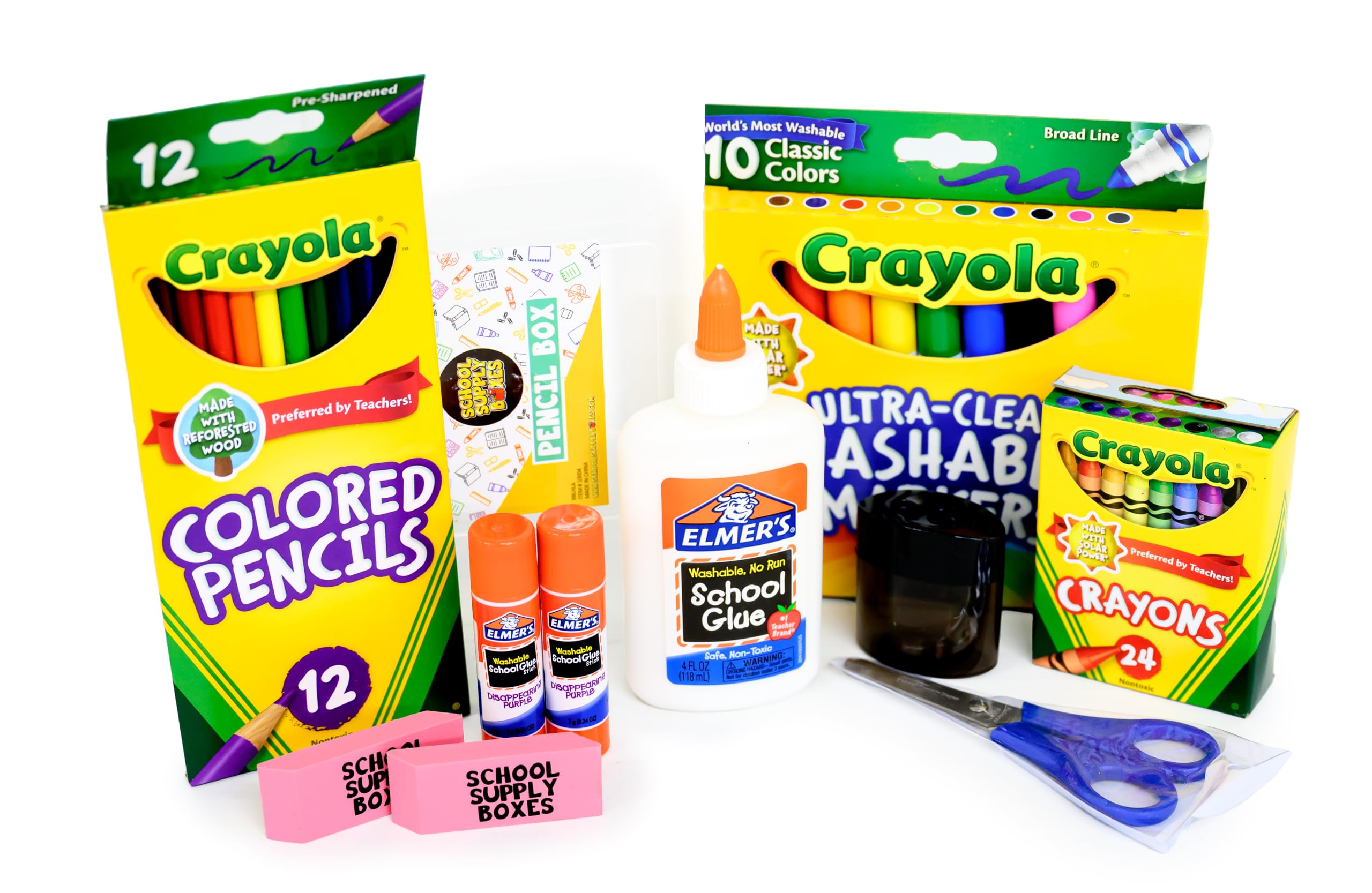 - This essential kit contains first day basics including (1) 24pk of crayons, (1) 12pk of color pencils, (1) 10pk of washable markers, (1) glue bottle, (2) glue sticks, (2) classic pink erasers, (1) 8pk of pencils, and (1) 5″ blunt tip scissors, (1) 12-inch wooden ruler, and (1) pencil box.