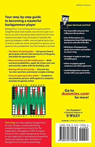 A comprehensive and fun guide to Backgammon! Backgammon is one of the oldest games in the world, the origins of which date back some 5000 years – and it’s still going strong. It enjoyed a huge resurgence in the 1970s, and then again in the 1990s with the popularity of the Internet, where millions of people play tournaments online every day. Today, backgammon’s following in the UK is huge, with a dedicated British Isles Backgammon Association, and hundreds of face-to-face tournaments taking place across the UK every year. In this book, backgammon expert Chris Bray walks you through the basics of setting up a board, opening strategies, middle and end-game tactics, and tips on when to make key moves. You’ll also get to grips with basic probabilities, the doubling cube and the 25% rule. And if you want to take your gaming further, there’s plenty of advice to get you started in tournament backgammon, as well as playing online. Suitable for both beginners and experienced player looking for more tips and techniques, Backgammon For Dummies includes coverage on: Starting and Playing the Game Handling the Middle Game Bearing Off (The Last Lap) Varying the Play About the author