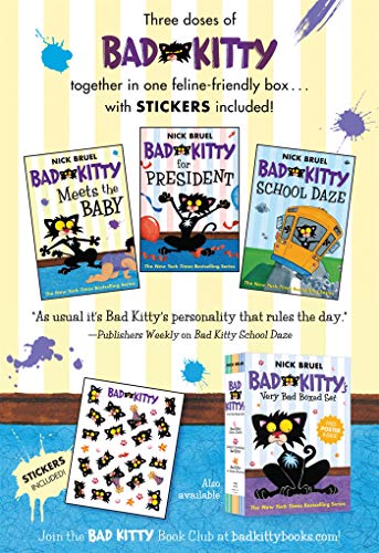 Hack up those fur balls, sharpen those claws because we’ve got three more Bad Kitty adventures from bestselling author Nick Bruel coming your way! In Bad Kitty Meets the Baby, Kitty’s owners are home with a big surprise for Kitty. But what is it? Kitty thinks it’s a dog. The neighbor cats are convinced it’s a cat. But we all know it’s really a BABY! In Bad Kitty for President, it’s time to elect a new president of the Neighborhood Cat Club. The results might surprise you. In Bad Kitty School Daze, Kitty and Puppy have been screaming, hissing, and fighting all over the house, and their owners have finally had enough. It’s time for school . . . obedience school. Included in the Bad Kitty’s Very Very Bad Boxed Set is a sheet of Bad Kitty stickers!