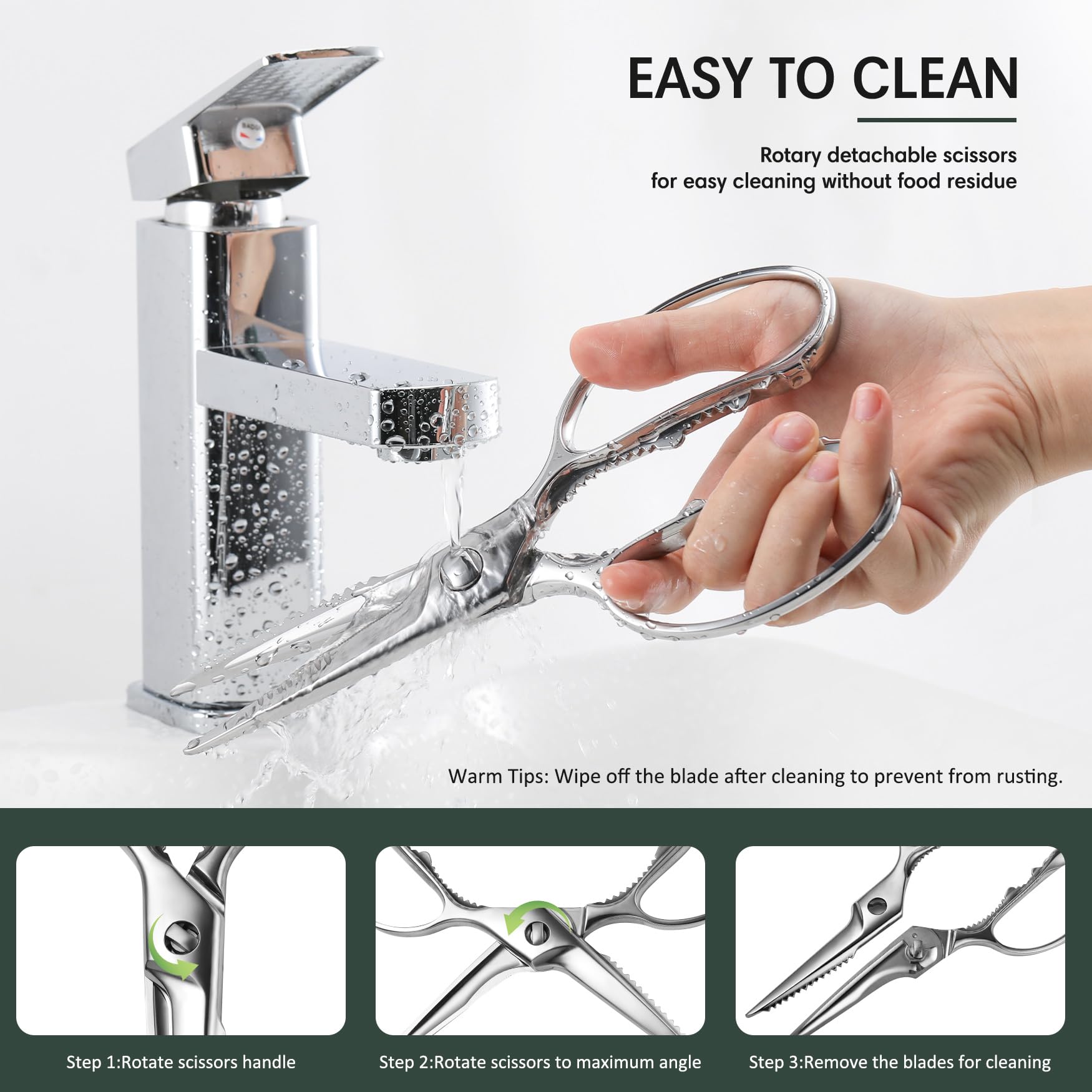 - Detachable Design – The innovative detachable kitchen scissor come apart design makes cleanup a breeze. Simply separate the blades for thorough cleaning, preventing food residue buildup. After use, simply rinse them with water or toss them in the dishwasher for quick and easy cleaning. Keep your kitchen scissor in pristine condition with minimal effort.