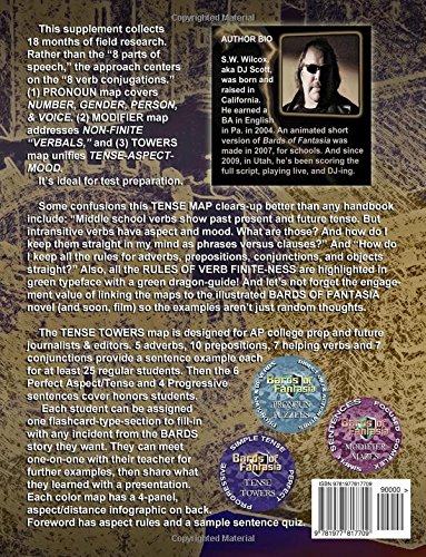 This supplement collects 18 months of field research. Rather than the “8 parts of speech,” the approach is the “8 verb conjugations.” (1) PRONOUN map covers NUMBER, GENDER, PERSON & VOICE. (2) MODIFIER map addresses NON-FINITE “VERBALS,” and (3) TOWERS map unifies TENSE-ASPECT-MOOD. It’s ideal for test preparation, and 25 students are covered for the price of a pizza. Some confusions this TENSE MAP clears-up better than any handbook include: “Middle school verbs show past present and future tense. But intransitive verbs have aspect and mood. What are those? And how do I keep them straight in my mind as phrases versus clauses?” And “How do I keep all the rules for adverbs, prepositions, conjunctions, and objects straight?” Also, all the RULES OF VERB FINITE-NESS are highlighted ingreen typeface with a green dragon-guide! And let’s not forget the engagement value of linking the maps to the illustrated BARDS OF FANTASIA novel (and soon, film) so the examples aren’t just random thoughts. The TENSE TOWERS map is designed for AP college prep and future journalists & editors. 5 adverbs, 10 prepositions, 7 helping verbs and 7 conjunctions provide a sentence example each for at least 25 regular students. Then the 6 Perfect Aspect/Tense and 4 Progressive sentences cover honors students. Each student can be assigned one flashcard-type-section to fill-in with any incident from the BARDS story they want. They can meet one-on-one with their teacher for further examples, then share what they learned with a short presentation. Each color map has a 4-panel, aspect/distance infographic on back. Foreword has aspect rules and dozens of sample sentences.