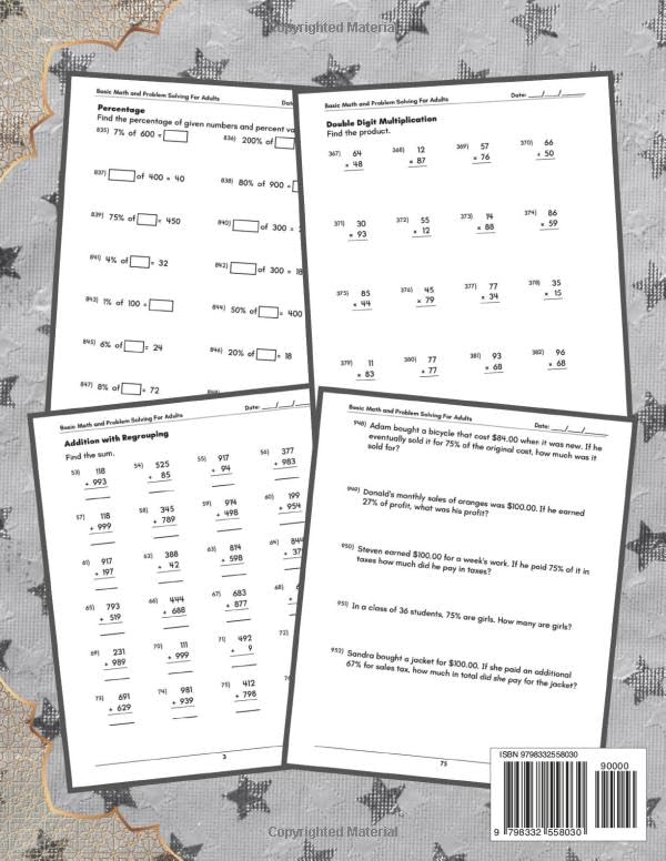 Embrace the power of numbers and conquer everyday math challenges with this comprehensive workbook designed specifically for adults. Whether you’re brushing up on foundational skills or seeking to improve your problem-solving abilities, this resource provides the tools you need to achieve mathematical confidence and success. Why Choose This Workbook? Boost Confidence: Revisit fundamental math concepts and build a strong foundation for tackling everyday calculations with ease. Enhance Problem-Solving Skills: Develop your ability to analyze and solve real-world problems using practical math skills. Self-Paced Learning: Progress at your own pace and focus on areas where you need the most practice. Comprehensive Coverage: This workbook provides a thorough review of essential math topics, including: Addition, Subtraction, Multiplication, and Division: Master basic operations with whole numbers, decimals, and fractions. Fractions and Percentages: Understand the relationship between fractions and percentages, convert between the two, and solve problems involving percentages. Word Problems: Apply your math skills to real-world scenarios and develop your problem-solving strategies. Features That Make Learning Effective: Clear Explanations: Easy-to-understand explanations break down each concept into manageable steps. Numerous Practice Problems: Abundant practice opportunities with varying levels of difficulty help you solidify your understanding. Answer Key: A comprehensive answer key allows you to check your work and track your progress. Invest in Your Mathematical Growth! Whether you’re returning to math after a long break or simply looking to sharpen your skills, this workbook is the perfect companion to help you achieve your goals. Rediscover the joy of learning and unlock your full mathematical potential!