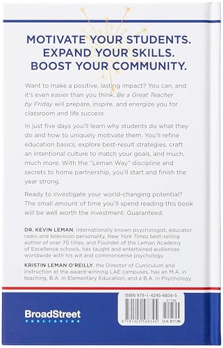 MOTIVATE YOUR STUDENTS. EXPAND YOUR SKILLS. BOOST YOUR COMMUNITY. Want to make a positive, lasting impact? You can, and it’s even easier than you think. Be a Great Teacher by Friday will prepare, inspire, and energize you for classroom and life success. In just five days you’ll learn why students do what they do and how to uniquely motivate them. You’ll refine education basics, explore best-result strategies, craft an intentional culture to match your goals, and much, much more. With the “Leman Way” discipline and secrets to home partnership, you’ll start and finish the year strong. Ready to investigate your world-changing potential? The small amount of time you’ll spend reading this book will be well worth the investment. Guaranteed.