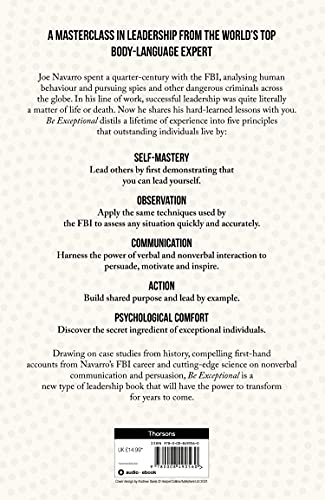 From internationally bestselling author and retired FBI agent Joe Navarro, a ground-breaking look at the five powerful principles that set exceptional individuals apart Joe Navarro spent a quarter century with the FBI, pursuing spies and other dangerous criminals across the globe. In his line of work, successful leadership was quite literally a matter of life or death. Now he brings his hard-earned lessons to you. Be Exceptional distils a lifetime of experience into five principles that outstanding individuals live by: Self-Mastery: To lead others, you must first demonstrate that you can lead yourself. Observation: Apply the same techniques used by the FBI to quickly and accurately assess any situation. Communication: Harness the power of verbal and nonverbal interaction to persuade, motivate, and inspire. Action: Build shared purpose and lead by example. Psychological Comfort: Discover the secret ingredient of exceptional individuals. Be Exceptional is the culmination of Joe Navarro’s decades spent analysing human behaviour, conducting more than 10,000 interviews in the field, and making high-stakes behavioural assessments. Drawing upon case studies from history, compelling first-hand accounts from Navarro’s FBI career, and cutting-edge science on nonverbal communication and persuasion, this is a new type of leadership book, one that will have the power to transform for years to come.