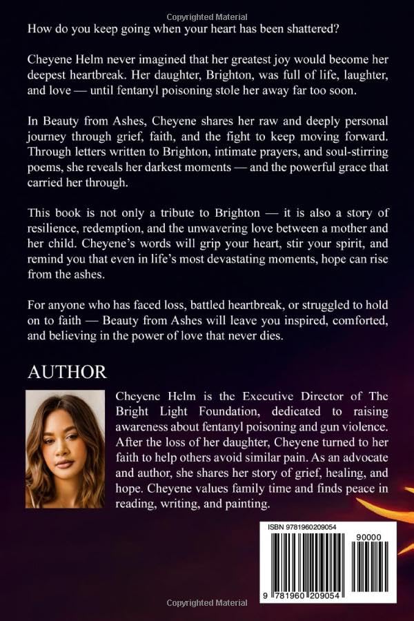 Beauty from Ashes: A Journey of Hope and Healing Discover a powerful and inspiring story of resilience in “Beauty from Ashes.” In this heartfelt memoir, Cheyene shares her journey of overcoming unimaginable loss and finding hope in the face of adversity. Through raw emotion and profound insights, she reveals how to transform pain into a source of strength and purpose. “Beauty from Ashes” is more than just a story; it’s a guide for anyone seeking to heal, grow, and find light in the darkest of times. Whether you’re facing personal challenges or seeking inspiration, this book will empower you to rise from the ashes and embrace a future filled with hope and beauty.