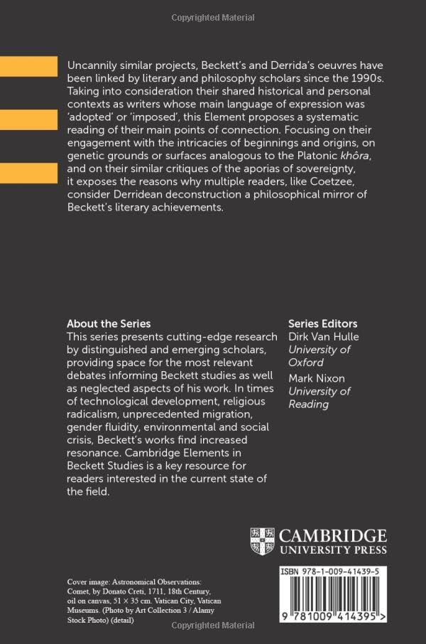 Uncannily similar projects, Beckett’s and Derrida’s oeuvres have been linked by literary and philosophy scholars since the 1990s. Taking into consideration their shared historical and personal contexts as writers whose main language of expression was ‘adopted’ or ‘imposed’, this Element proposes a systematic reading of their main points of connection. Focusing on their engagement with the intricacies of beginnings and origins, on genetic grounds or surfaces analogous to the Platonic khora, and on their similar critiques of the aporias of sovereignty, it exposes the reasons why multiple readers, like Coetzee, consider Derridean deconstruction a philosophical mirror of Beckett’s literary achievements.