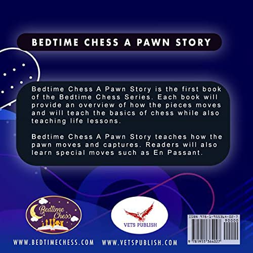 Welcome to the Bedtime Chess Series. The first series of children’s chess books to help children learn chess at bedtime or any other time. Bedtime Chess A Pawn Story is an educational book which will teach you all about how to use a pawn in the game of chess. It will cover how to move a pawn and useful tactics for pawns. This book may serve as an introduction for kids or adults. You can learn how to play chess along your family and maybe one day beat your grandmother or grandfather in a game of chess. Could you tell me more about the interior of this book? This book features a total of 27 pages and is 8.5 x 8.5 inches in size. Each page in this book has been created with the intention of combining chess and life lessons. They will learn to think ahead and strategies of chess such as passed pawns and special moves such as en passant. It will also teach the importance of teamwork. Each page is printed on high-quality white paper with premium ink to ensure the best user experience Inside you will find colorful diagrams and family friendly images. We hope that you and your loved ones read it over and over again and maybe one day be a chess champion. This book and the bedtime chess series feature unique cover design which represents all children. So what are you waiting for? Scroll up to the top of the page and click the buy now button!