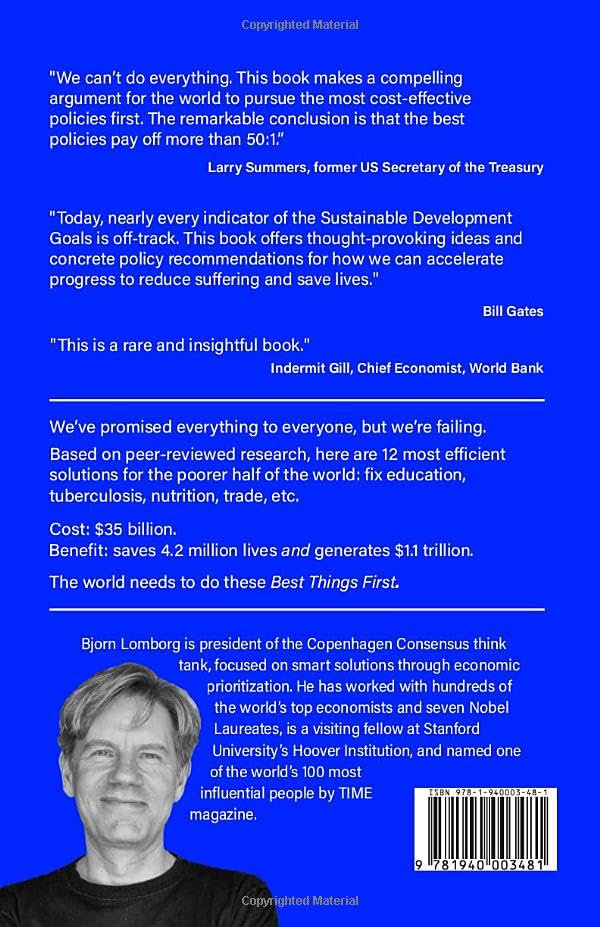 Now selected as one of the Best Books of 2023 by The Economist. In this urgent, thought-provoking book, Bjorn Lomborg presents the 12 most efficient solutions for the world’s poorest and our global SDG promises. * If you want to make the world better, Best Things First is the book to read. World leaders have promised everything to everyone. But they are failing. The UN’s Sustainable Development Goals are supposed to be delivered by 2030. The goals literally promise everything, like eradicating poverty, hunger and disease; stopping war and climate change, ending corruption, fixing education along with countless other promises. This year, the world is at halftime for its promises, but nowhere near halfway. Together with more than a hundred of the world’s top economists, Bjorn Lomborg has worked for years to identify the world’s best solutions. Based on 12 new, peer-reviewed papers, forthcoming in Cambridge University Press’ Journal of Benefit-Cost Analysis, this book highlights the world’s best policies. Some things are difficult to fix, cost a lot, and help little. Other problems we know how to fix, at low cost, with remarkable outcomes. We should do the smart things first. Governments and philanthropists should focus on these 12 smartest things. Fix tuberculosis, malaria, and chronic disease, tackle malnutrition, improve education, increase trade, implement e-procurement, and secure land tenure. This will improve the world amazingly. The cost is $35 billion a year. The benefits include saving 4.2 million lives each year and generating $1.1 trillion more for the world’s poor. We can definitely afford it: The cost of $35 billion is equivalent to the increase in annual global spending on cosmetics over the last two years. This is likely the best thing the world can do this decade.