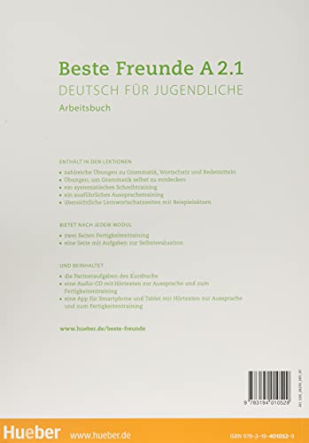 Libro de ejercicios + CD-Audio con las audiciones del libro de ejercicios correspondiente al A2.1 de Beste Freunde, metodo claro y atractivo para la E.S.O. que se basa en las historias de un grupo de adolescentes