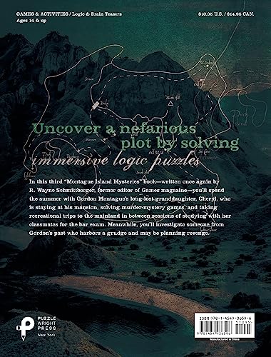 The second sequel to the popular Montague Island books introduces Gordon Montague’s daughter–and once again gives solvers a mystery to unravel along with the logic puzzles and games! Take a third trip back to Montague Island for both mystery and puzzle solving! Gordon Montague’s long-lost daughter, Cheryl–about to graduate from law school–spends the summer on and off the island. Along with a group of classmates, she enjoys murder-mystery games, takes trips to the mainland, and studies for the bar exam. Gordon, however, has reason to believe that someone with a grudge is planning revenge on him. So he once again asks Taylor to investigate, and keep an eye on everyone. Readers get to study maps and blueprints, play all sorts of games, collect wildflowers, visit an amusement park, and more, all while uncovering a nefarious plot.