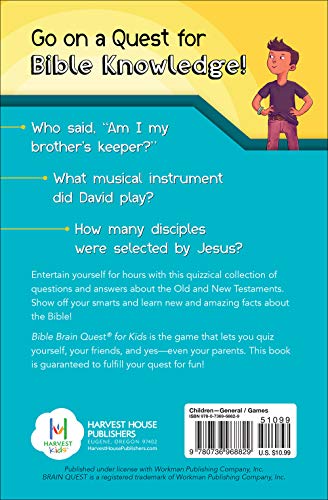 Go On a Quest for Bible Knowledge! Who said, “Am I my brother’s keeper?” What musical instrument did David play? How many disciples were selected by Jesus? Keep your kids entertained for hours with this quizzical collection of questions and answers about the Old and New Testaments. Children six and up will love showing off their smarts and learning new and amazing facts about the Bible. Bible Brain Quest(r) for Kids is the game that lets them quiz themselves, their friends, and yes–even you. This book is guaranteed to fulfill your quest for family fun!