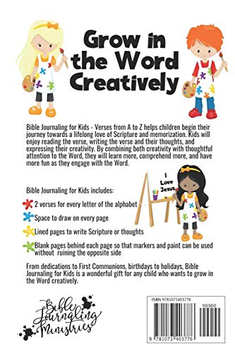 Bible Journaling for Kids – Verses from A to Z helps children begin their journey towards a lifelong love of Scripture and memorization. Kids will enjoy reading the verse, writing the verse and their thoughts, and expressing their creativity. By combining both creativity with thoughtful attention to the Word, they will learn more, comprehend more, and have more fun as they engage with the Word. Bible Journaling for Kids includes: 2 verses for every letter of the alphabet Space to draw on every page Lined pages to write Scripture or thoughts Blank pages behind each page so that markers and paint can be used without ruining the opposite side Over 45 bonus images to cut out, paste, or trace Access to the free 10-day Bible journaling course for beginners From dedications to First Communions, birthdays to holidays, Bible Journaling for Kids is a wonderful gift for any child who wants to grow in the Word creatively.