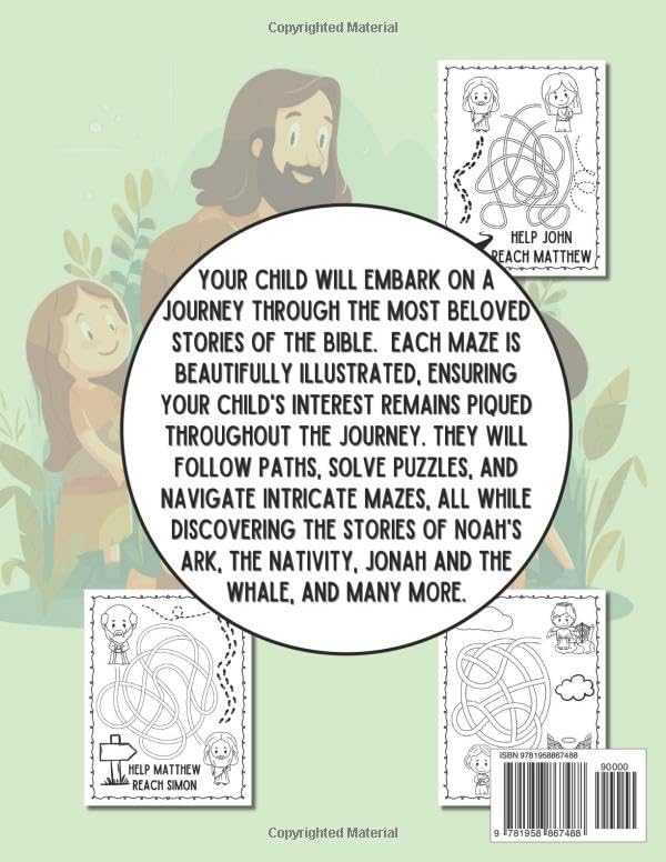 “Bible Mazes for Kids, Vol2, An Exciting Journey Through Scripture” Some of the Stories in the Book include: Adam and Eve Jesus and the Last Supper King Solomon Abraham and Isaac Jacob and the Ladder to Heaven Samson John the Baptist Embark on an exciting journey of discovery with “Bible Mazes for Kids Vol. 2” – an engaging maze book designed to captivate young minds while reinforcing biblical stories and values. Inside these pages, children will navigate their way through intricately crafted mazes that bring to life beloved Bible tales. From the miraculous escape through the Red Sea to David’s brave encounter with Goliath, each maze is a thrilling adventure waiting to be unraveled. Watch as your child develops problem-solving skills and patience while connecting with the rich narratives of the Bible. The carefully selected mazes not only entertain but also provide a unique way for kids to absorb important biblical lessons. Bring the Bible to life through interactive learning! Grab your copy of “Bible Mazes for Kids Vol. 2” today and witness the joy on your child’s face as they navigate through these captivating mazes, fostering a deeper understanding of the timeless stories within the Scriptures. Let the exploration begin – order now and make learning about the Bible an exciting adventure for your little one!