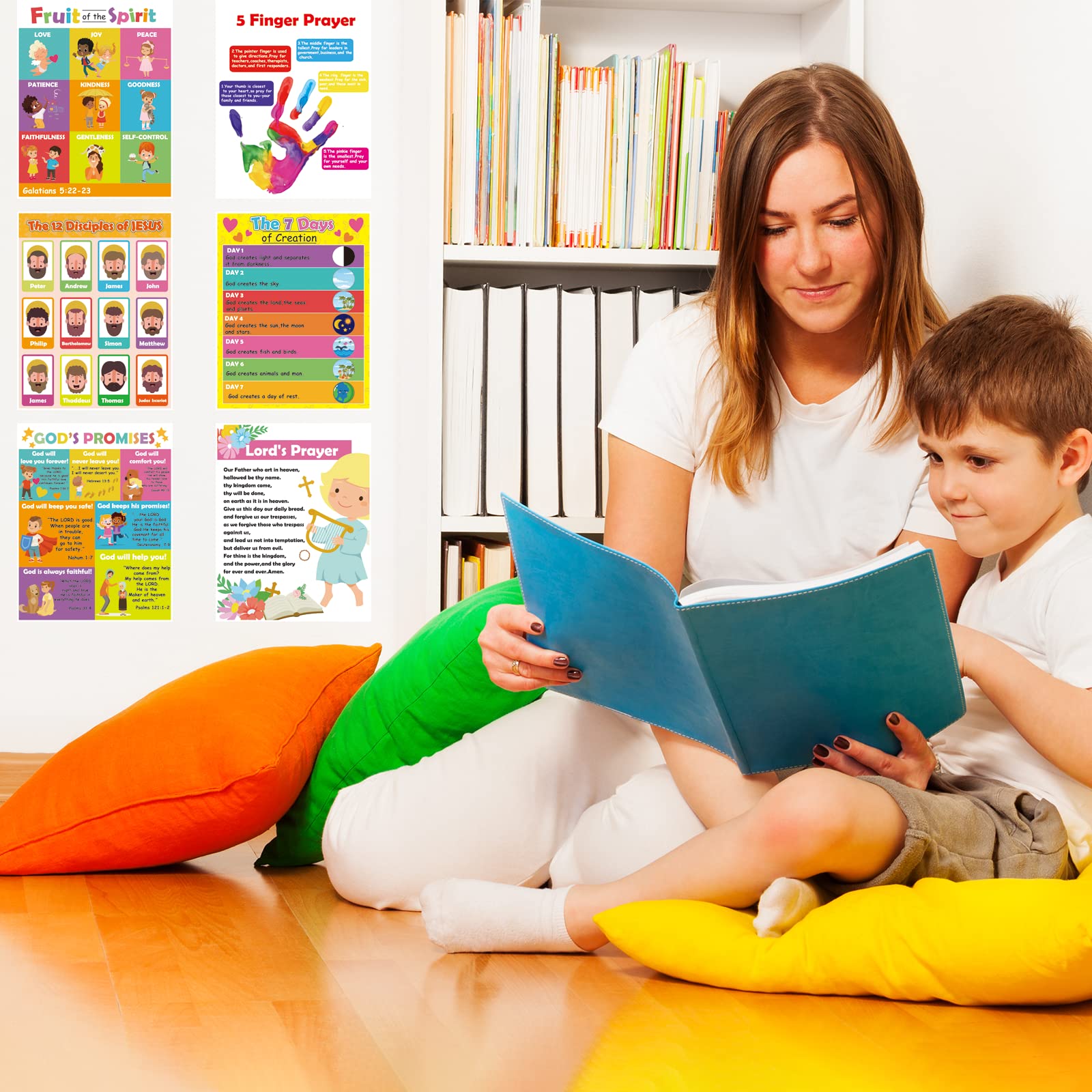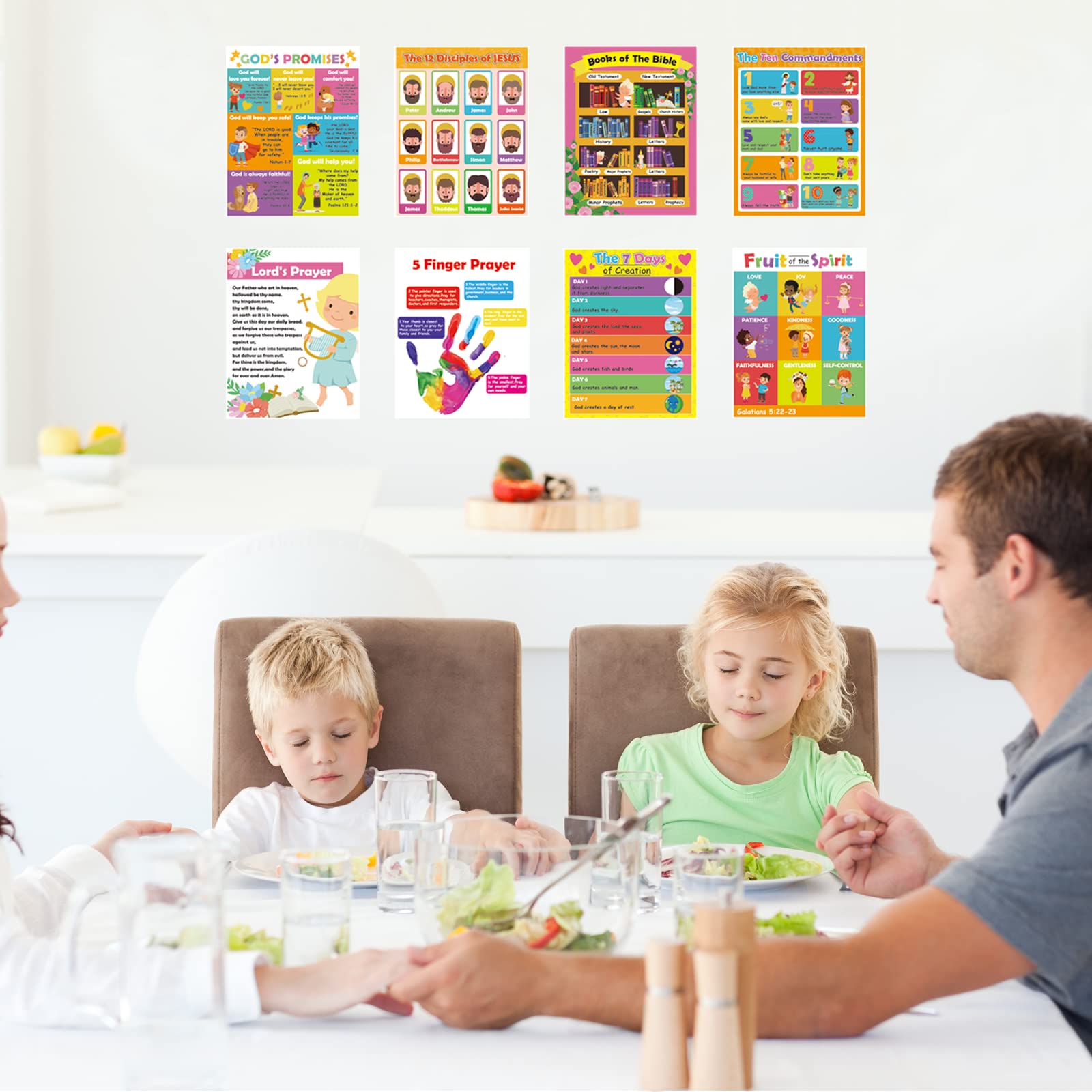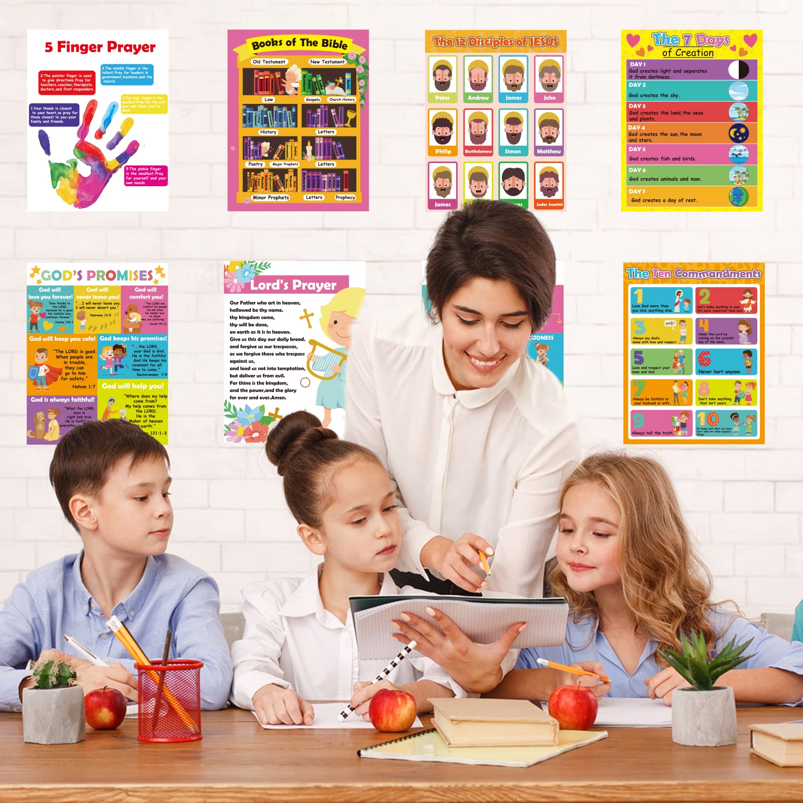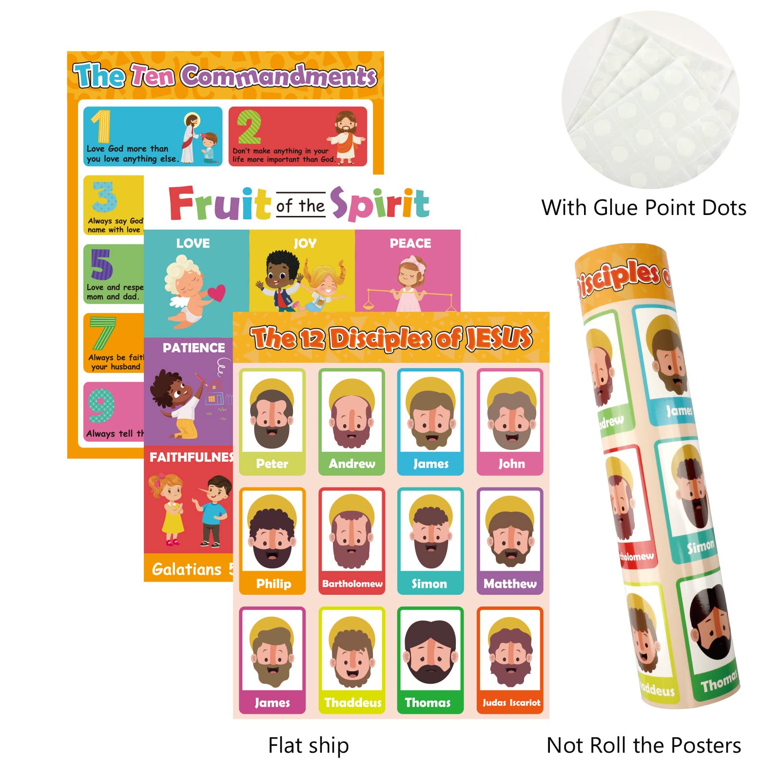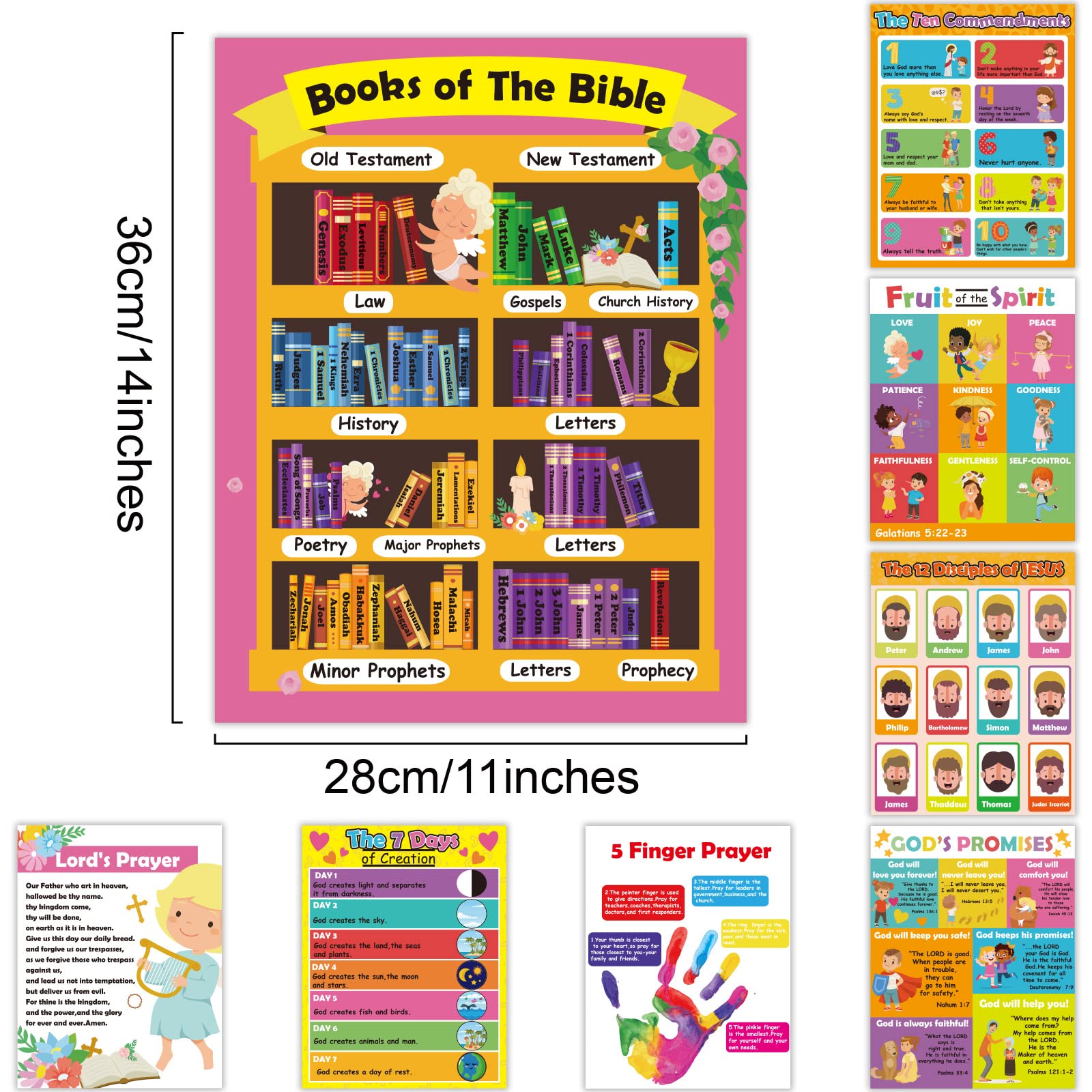 - [(Bible Posters)] Bible posters includes 8 pieces posters – Books of the Bible,The ten commandments,Fruit of the spirit,Lord’s prayer,God’s promises,The 7 days of creation,The 12 disciples of Jesus,5 finger prayer.It is perfect for home, kindergarten, elementary school, middle school, homeschool room, learning center, daycares center and after school programs, office, dorm room etc. The colorful well designed picture is very eye-catching and can easily arouse students’ interests.