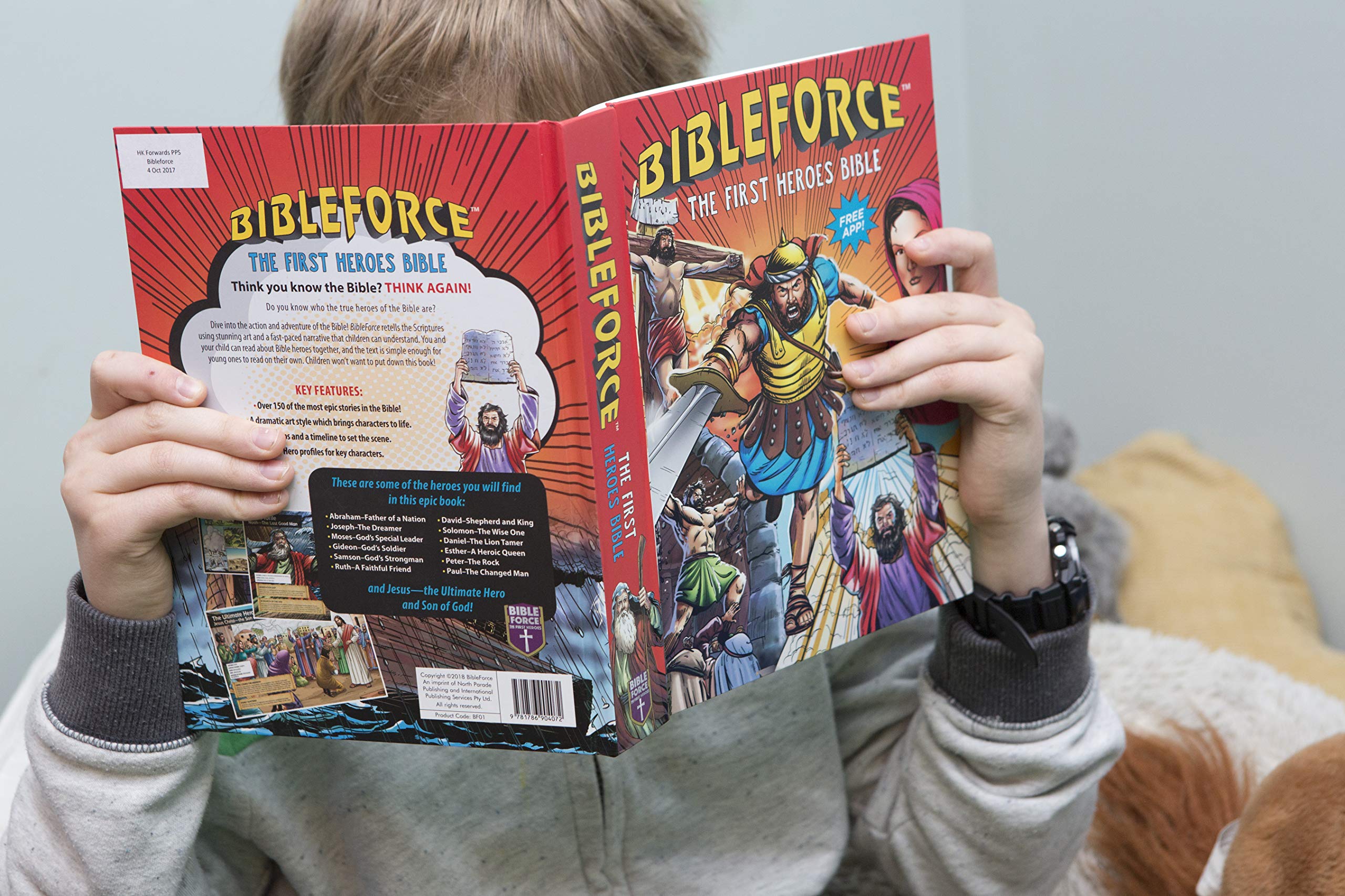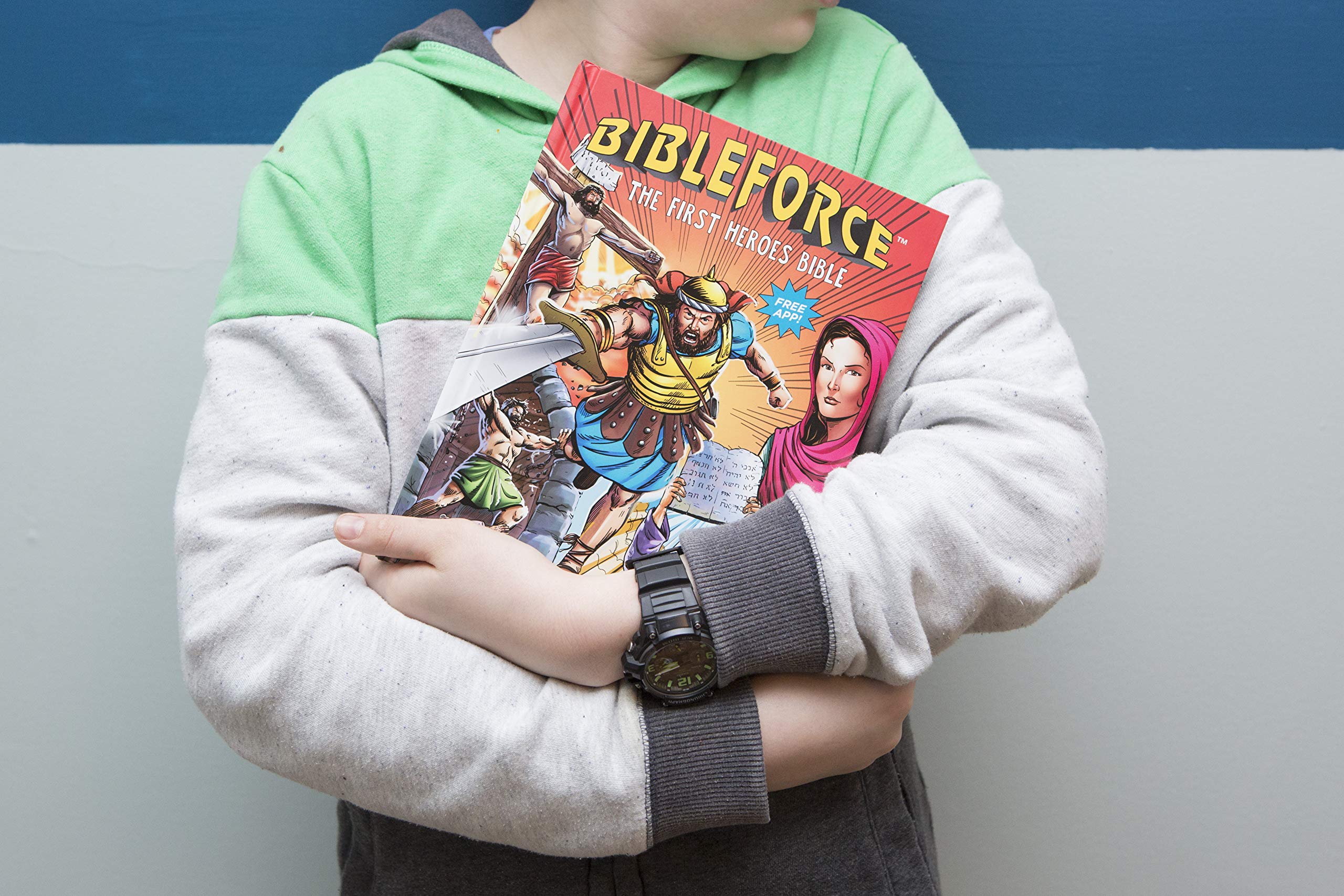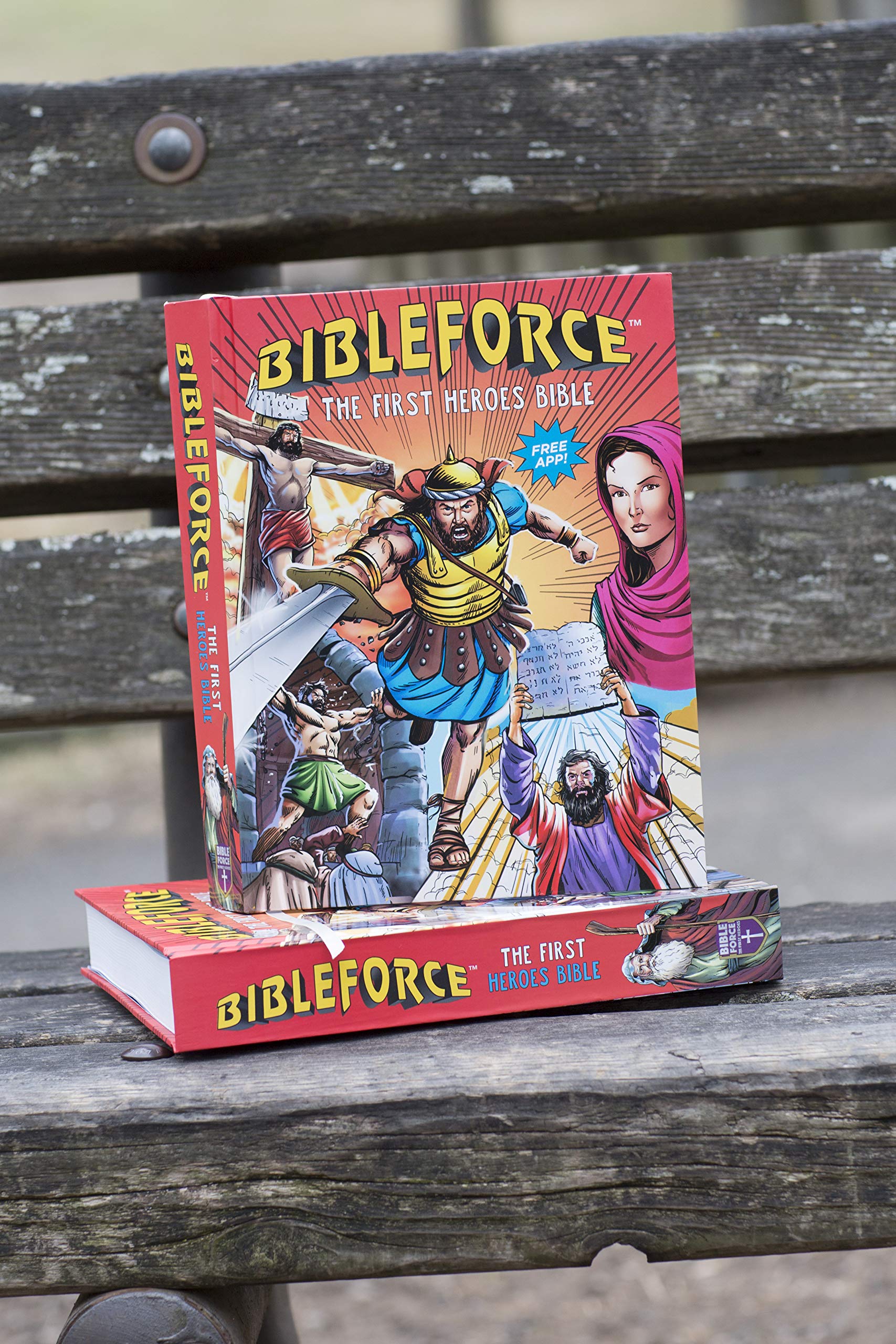 Kids love superheroes! They love to read the colorful comics that tell their stories. So your kids are going to LOVE BibleForce: The First Heroes Bible. Told as an amazing graphic novel, this book is JAM-PACKED with nearly 200 stories of the FIRST heroes–the heroes from the Bible–and their adventures. Through action-packed artwork and fast-paced dialog, your children will learn biblical stories in a fun and educational way. This incredible volume includes the stories of how In the beginning, God created the world. BANG! Jacob wrestled with God. ZOWIE! Moses led the Israelites out of slavery. POW! David, a shepherd boy, slayed a giant. WHAM! John the Baptist ate locusts. EEW! Jesus healed people who were sick, injured, and broken-hearted. WOW! And how Jesus died but came to life again. HALLELUJAH! BibleForce is perfect for Kids ages 7-12 Church youth groups or reading clubs New readers of the Bible or kids interested in learning more about biblical stories Kids interested in history and the amazing heroes in our Bible Kids will spend delightful hours enjoying the rich illustrations and reading the edge-of-your-seat stories. They’ll learn that through God’s power, they can be superheroes for God, too.