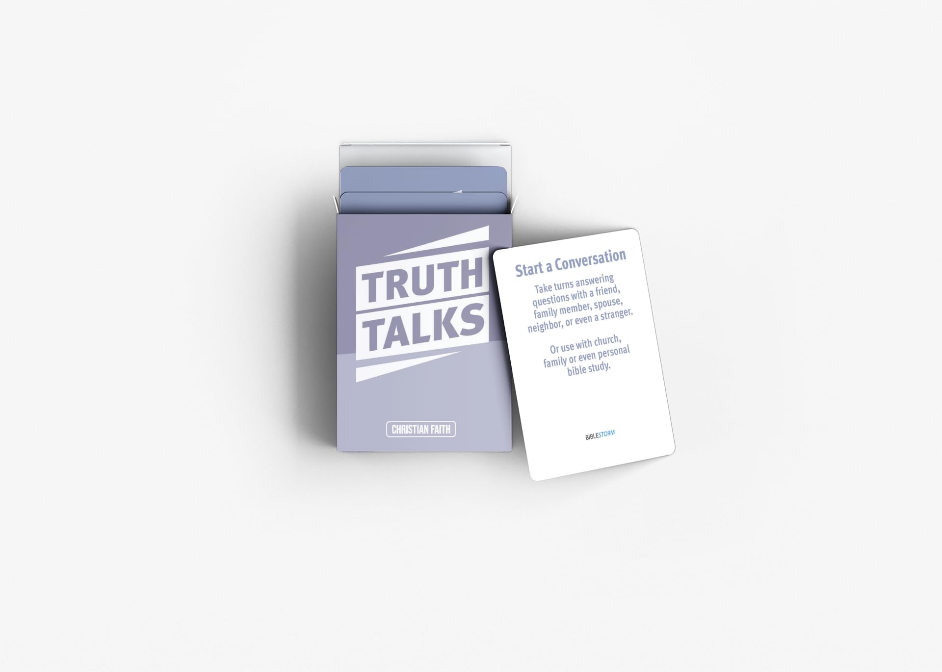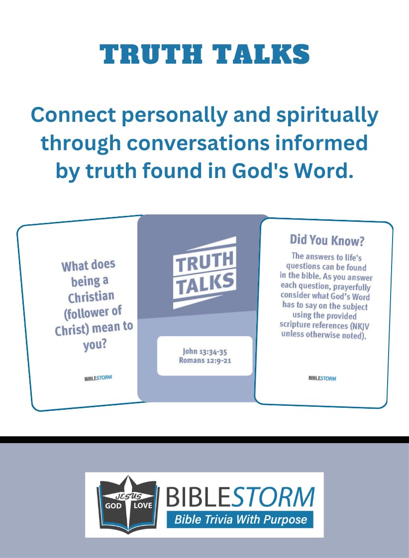 Truth Talks by BibleStorm is a fun and engaging way to explore everyday life topics with family, friends, and even strangers from a biblical perspective. The game includes 50 conversation starter cards with discussion prompts and related Bible references. The cards are perfect for church Bible Study, Sunday school, evangelism outreach, or family game night. The game is easy to play and can be enjoyed by people of all ages and backgrounds (including Christians and non-Christians alike). Truth Talks flash cards are a great way to have intimate conversations and fellowship with one another and gain a deeper understanding of God’s Truth (i.e. the bible). These cards are also an easy way to share the Christian faith with others.