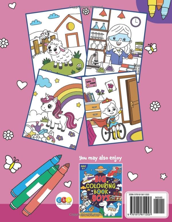 Big Colouring Book for Girls: Inspiring and Positive Scenes for Children plus Cute Animals, Rainbows, Fashion, Princesses & More. Let your child’s imagination soar with this Big Colouring Book for Girls, featuring 50 beautifully hand-drawn pages filled with everything girls love! From adorable animals, fairies, unicorns, mermaids, and rainbows to empowering illustrations that show girls being strong, smart, and unstoppable, this book is designed to delight, inspire, and build confidence in young artists aged 4 and up. This unique colouring book blends fun, fantasy, and positivity, offering a mix of super-cute designs alongside scenes of girls excelling in sports, science, business, and adventure. Whether your child loves dreamy fairytale creatures or bold real-world role models, they’ll find plenty of exciting pages to bring to life with colour. 50 BIG Hand-Drawn Illustrations – Thoughtfully designed for young girls to enjoy and express their creativity. A Celebration of Strength & Imagination – Cute, magical images plus positive portrayals of girls achieving their dreams. Perfect for Little Hands – Large, easy-to-colour drawings suitable for ages 4 and up. Big Single-Sided Pages (8.5×11 inches) – Helps prevent bleed-through. Encourages Creativity & Confidence – A fun way to inspire self-expression and a positive mindset. Whether colouring a playful pony, a sparkling fairy, or a future astronaut, this book will provide hours of fun and inspiration. Let your child explore, dream, and believe in themselves–one colouring page at a time! Get your copy today!