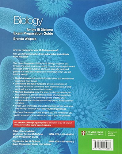 This Exam Preparation Guide contains up-to-date material that matches the new 2016 IB diploma syllabus and offers support for students as they prepare for their IB Diploma Biology exams. The book is packed full of Model Answers, Annotated Exemplar Answers, Worked Examples and Hints to help students hone their revision and exam technique and avoid common mistakes. These features have been specifically designed to help students apply their knowledge in exams. This Exam Preparation Guide has been written in an engaging and student friendly tone making it perfect for international learners.